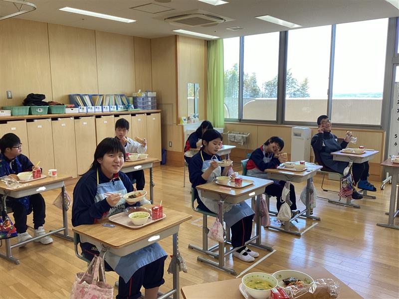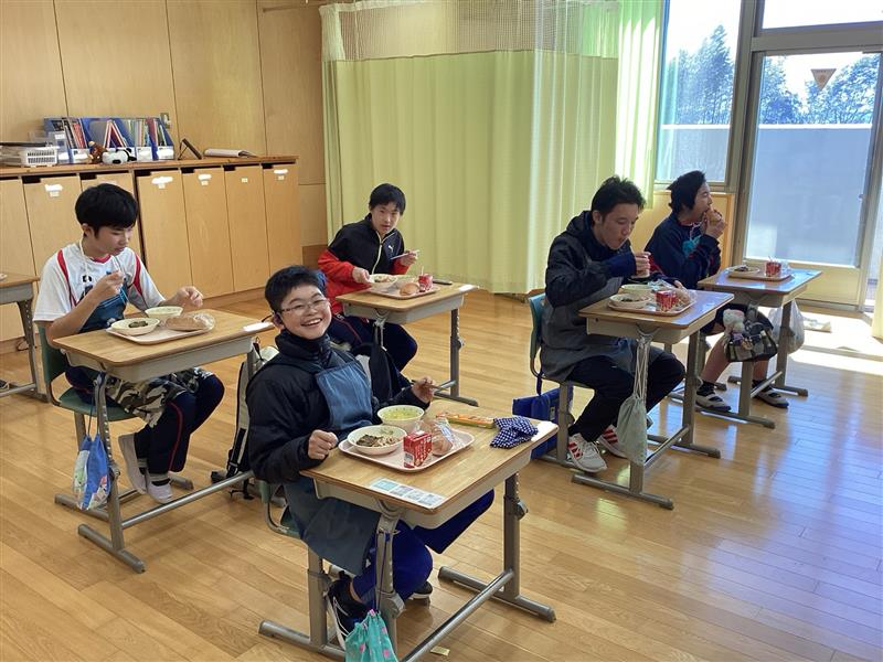 今年度最後の給食は、みんなが楽しみにしていた時間となりました。今日のメニューは、パン、牛乳、鶏肉のバジル焼き、もやしとにんじんのソテー、そして香り豊かなコーンスープでした。生徒たちは、「おいしい!」と笑顔を見せながら、友達と会話を楽しみつつ、ゆっくりと味わって食べていました。特に鶏肉のバジル焼きは人気が高く、おかわりの声も聞こえてきました。こうしてみんなで囲む給食の時間は、学校生活の大切なひとときです。最後の給食も、温かく楽しい雰囲気の中でいただくことができました。