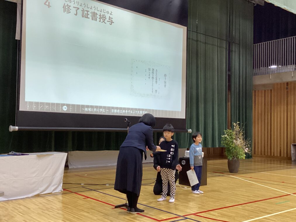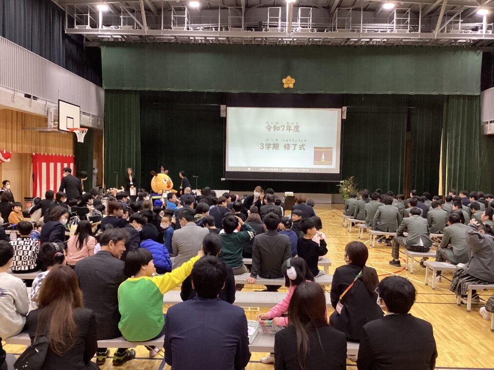 令和7年度の修了式を行いました。式では、各学年の代表生徒へ修了証の授与が行われ、1 年間の成長を感じた姿が印象的でした。また、1年間取り組んでいただいた YS 活動の様子をスライドで見て、活動を支えてくださった方々への感謝の気持ちを新たにしていました。さらに、中谷財団入選の報告があり、中学年全員で前に出て表彰を受けました。。続いて、わくフォト表彰式も行われ、受賞した生徒たちは少し恥ずかしそうでしたが誇らしげに賞状を受け取っていました。1年間の学習や行事を振り返ると、一人一人が確かに成長し、できることが大きく広がった一年でした。学年が一つ上がり、新しい環境でのスタートとなります。これまで培ってきた力を生かし、自信を持って次の一歩を踏み出してください。先生たちは、これからも皆さんの挑戦と成長を全力で応援します。一年間、本当によく頑張りました。春休みは安全に過ごし、元気な姿でまた会いましょう。