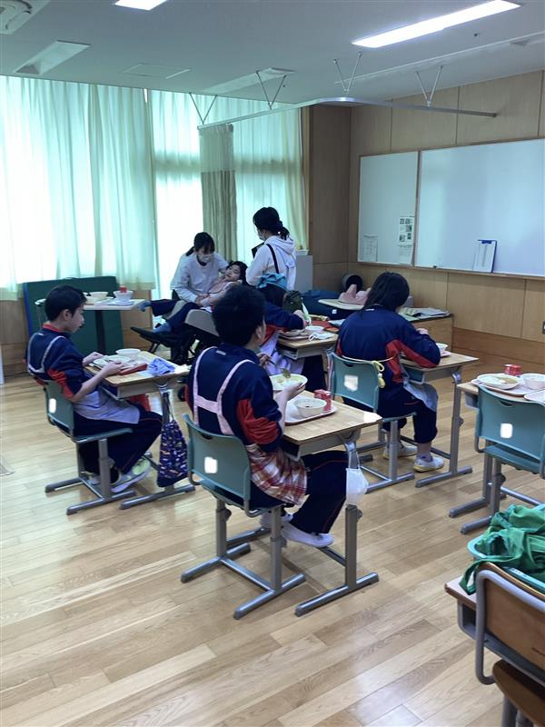 中学部の様子新学期が始まり、今年度最初の給食は、みんなが大好きなポークカレー。教室にはスパイスのよい香りが広がり、配膳の時間から自然と笑顔が見られました。デザートのフルーツカクテルには果物がたくさん入っており、色とりどりで見た目も楽しい一品でした。先生や友だちと一緒に、落ち着いた雰囲気の中で食事を楽しむ姿から、新しい学期への期待が感じられました。