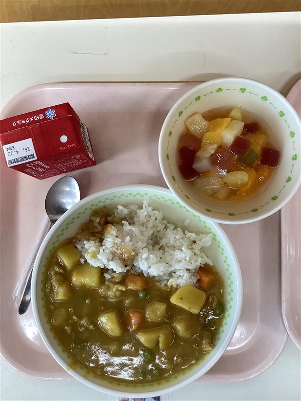 新学期が始まり、今年度最初の給食は、みんなが大好きなポークカレー。教室にはスパイスのよい香りが広がり、配膳の時間から自然と笑顔が見られました。デザートのフルーツカクテルには果物がたくさん入っており、色とりどりで見た目も楽しい一品でした。先生や友だちと一緒に、落ち着いた雰囲気の中で食事を楽しむ姿から、新しい学期への期待が感じられました。