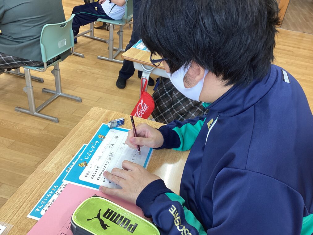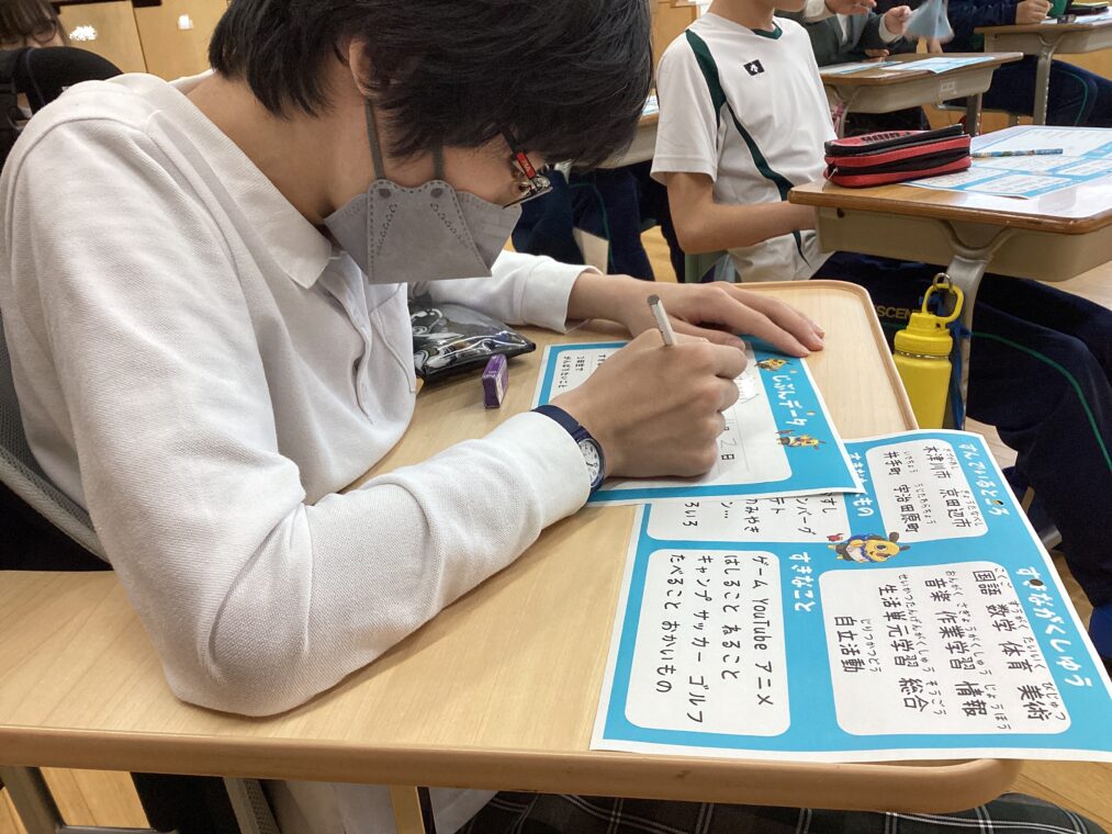 今日は学年はじめということで、自己紹介シートを書いていました。