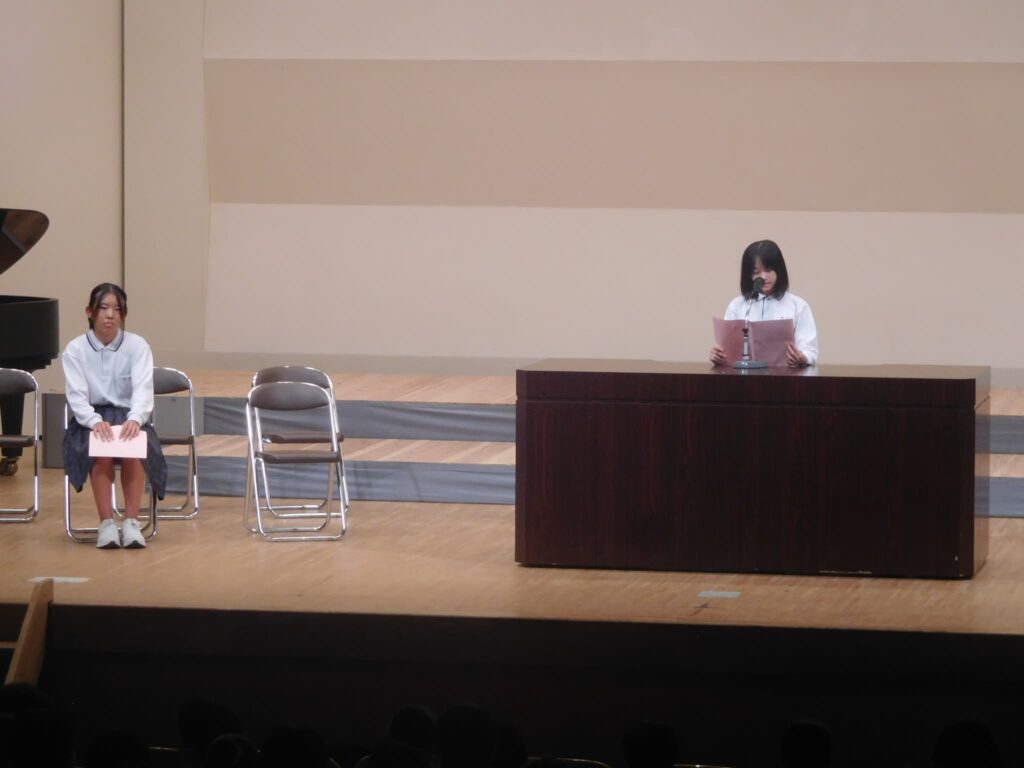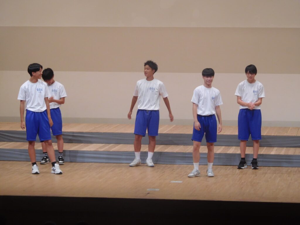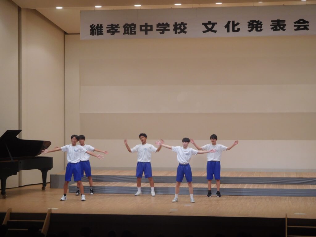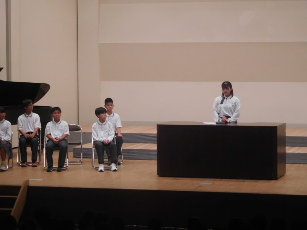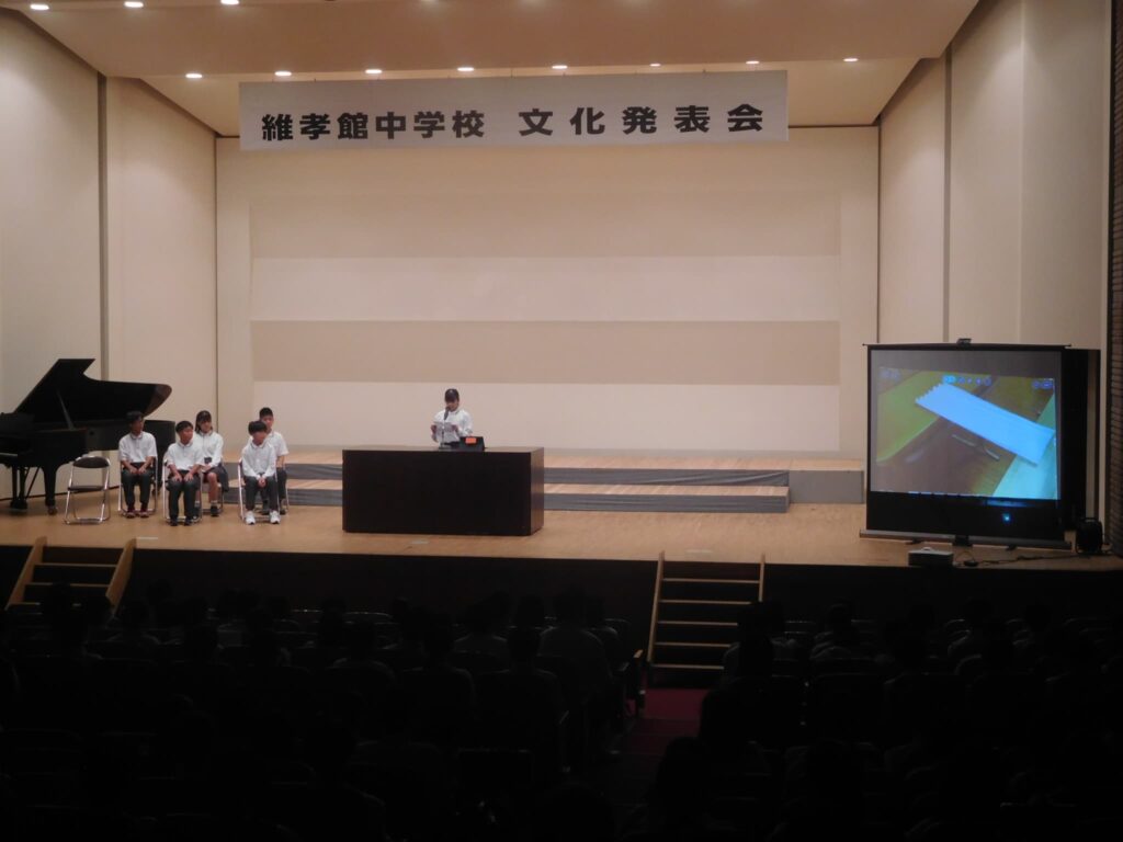 先週の木曜日(9/18)、午前10時から町総合文化センターさざんかホールで本校の文化発表会を開催しました。文化センターに入ると美術部が夏休みにみんなで制作した巨大絵画「幸せな贈り物」が私たちを出迎えてくれ、作品名のとおり幸せな気持ちにしてくれました。開会式に続き、オープニングを飾ったのは吹奏楽部。京都府吹奏楽コンクール2年連続金賞に輝き、初めて出場した関西吹奏楽コンクールでも演奏した「梁塵秘抄~熊野古道の幻想」から「ジブリメドレー」、「ヘビーローテーション」、アンコール曲の「宝島」まで4曲演奏し、この日の演奏を最後に引退する3年生のソロ演奏、1年生のダンス等もあり、会場は手拍子や声援で大いに盛り上がりました。 続いて各学年の授業や夏休みの自由研究で取り組んだ学習の発表がありました。理科、技術、数学はタブレットを使い、仮説を立てて実験をしたり計算式を用いたりして、聞いている方も一緒に考えられるように工夫されていました。英語のスピーチは将来の夢や頑張りたいことなどを流暢な英語で聞き手に語りかけました。国語の作文発表では、社会や身の回りの生活について普段考えていることを論理的でわかりやすい文章で堂々と発表しました。最後は、体育の創作ダンスの発表でした。3年男子が自分たちで考えた振り付けでリズムに乗って笑顔で楽しく踊り、会場から大きな拍手が沸き起こりました。どの発表も自分が興味関心を持ったことを調べ、なぜそうなるのか理由を考えたり仮説を立てたり、検証実験を行ったりして学びを深めていく姿が印象的でした。また、立派な態度で司会進行を務めてくれた生徒会本部役員の皆さん、ありがとうございました。なお、合唱コンクール、学年合唱の様子は日を改めて掲載予定です。
