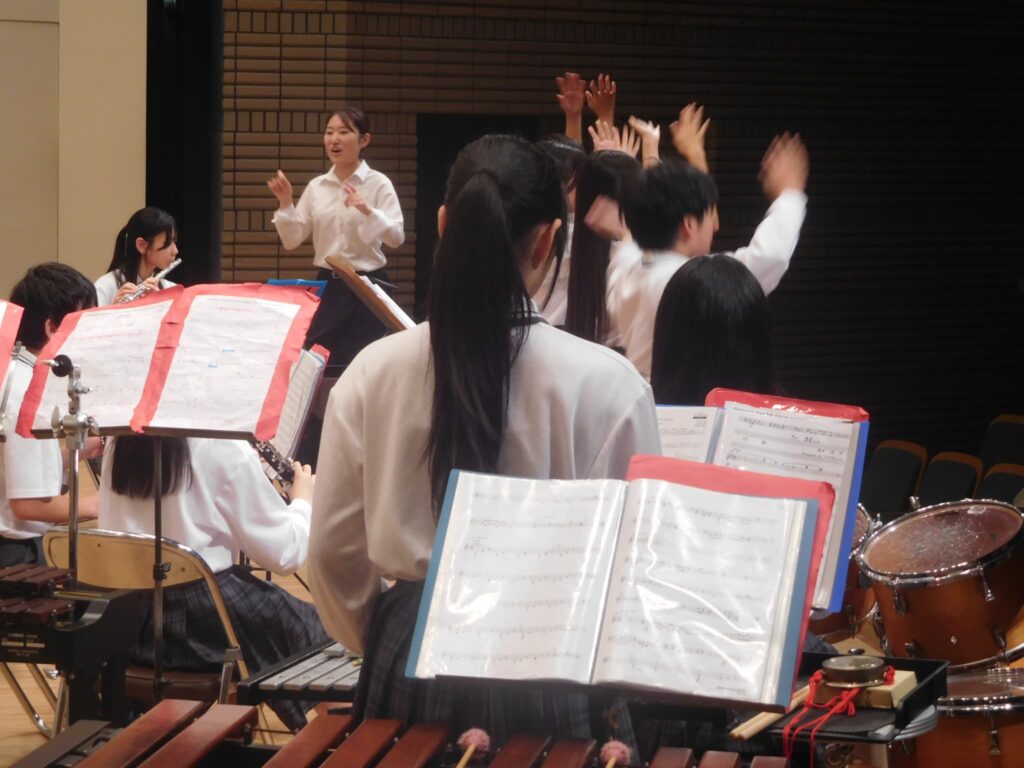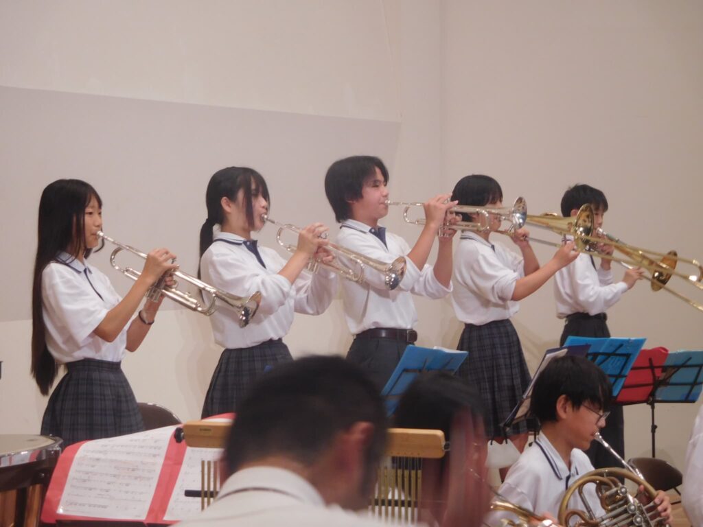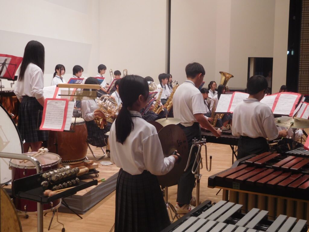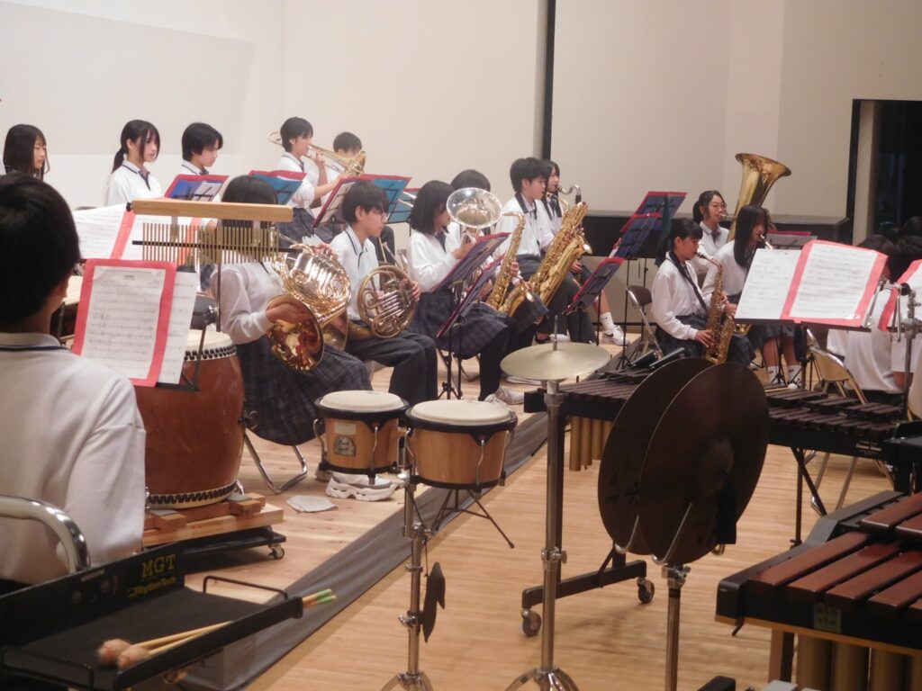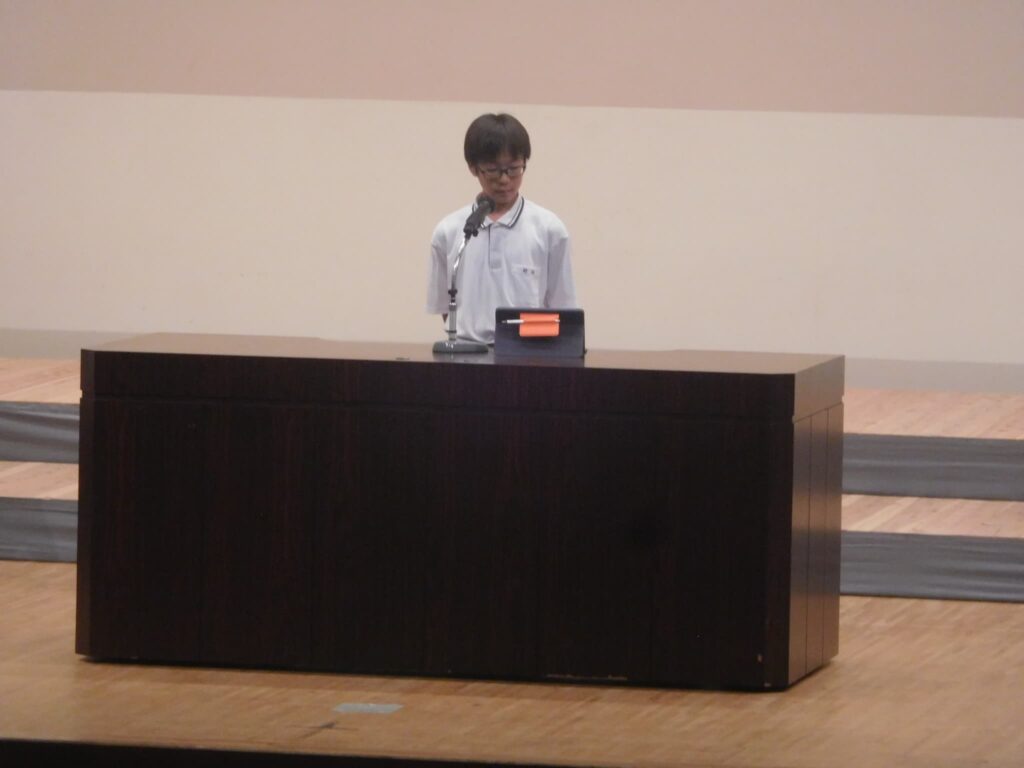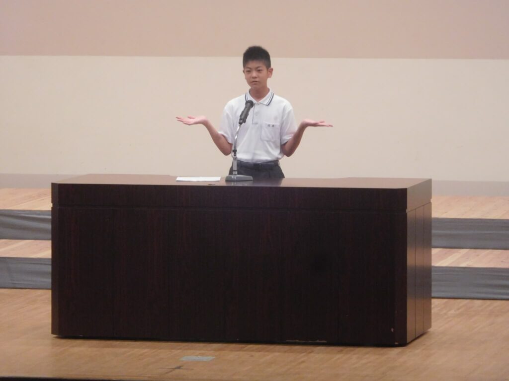 先週の木曜日(9/18)、午前10時から町総合文化センターさざんかホールで本校の文化発表会を開催しました。文化センターに入ると美術部が夏休みにみんなで制作した巨大絵画「幸せな贈り物」が私たちを出迎えてくれ、作品名のとおり幸せな気持ちにしてくれました。開会式に続き、オープニングを飾ったのは吹奏楽部。京都府吹奏楽コンクール2年連続金賞に輝き、初めて出場した関西吹奏楽コンクールでも演奏した「梁塵秘抄~熊野古道の幻想」から「ジブリメドレー」、「ヘビーローテーション」、アンコール曲の「宝島」まで4曲演奏し、この日の演奏を最後に引退する3年生のソロ演奏、1年生のダンス等もあり、会場は手拍子や声援で大いに盛り上がりました。 続いて各学年の授業や夏休みの自由研究で取り組んだ学習の発表がありました。理科、技術、数学はタブレットを使い、仮説を立てて実験をしたり計算式を用いたりして、聞いている方も一緒に考えられるように工夫されていました。英語のスピーチは将来の夢や頑張りたいことなどを流暢な英語で聞き手に語りかけました。国語の作文発表では、社会や身の回りの生活について普段考えていることを論理的でわかりやすい文章で堂々と発表しました。最後は、体育の創作ダンスの発表でした。3年男子が自分たちで考えた振り付けでリズムに乗って笑顔で楽しく踊り、会場から大きな拍手が沸き起こりました。どの発表も自分が興味関心を持ったことを調べ、なぜそうなるのか理由を考えたり仮説を立てたり、検証実験を行ったりして学びを深めていく姿が印象的でした。また、立派な態度で司会進行を務めてくれた生徒会本部役員の皆さん、ありがとうございました。なお、合唱コンクール、学年合唱の様子は日を改めて掲載予定です。