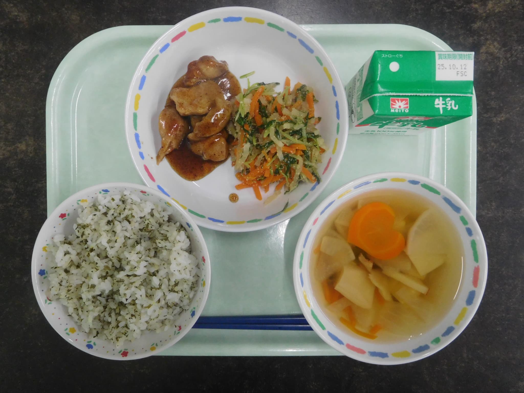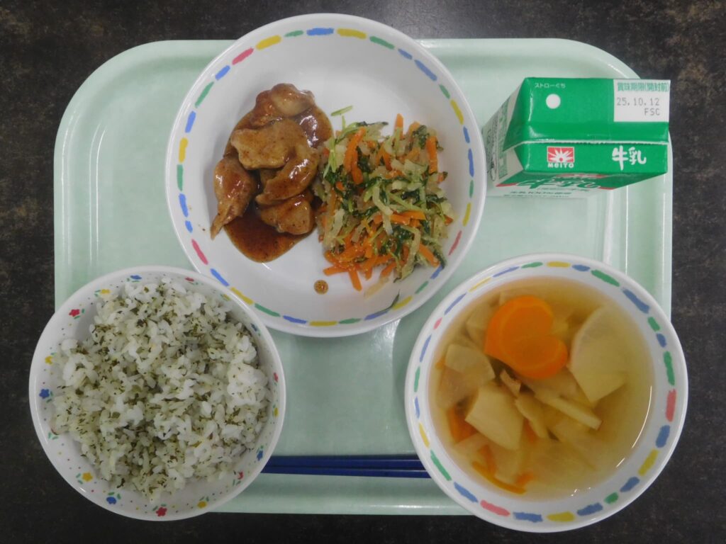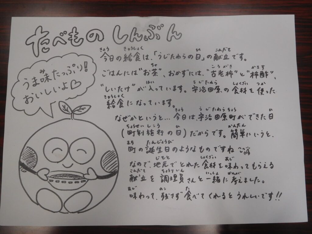 昨日、9月30日は、1956年(昭和31年)に田原村と宇治田原村が合併し「宇治田原町」が誕生した記念の日でした。それにちなんで、昨日の給食は「うじたわらの日」の献立でした。「茶ッピーランチ」でおなじみのお茶を使った「碾茶ごはん」、具だくさんの「すまし汁」、地元の特産品にもなっている古老柿を使った「鶏肉の古老柿だれ」、町内産のしいたけを使った「宇治田原野菜の柿酢和え」のメニューをみんなでおいしくいただきました。町共同調理場のみんさん、いつもおいしく栄養満点の給食を作っていただき、ありがとうございます。