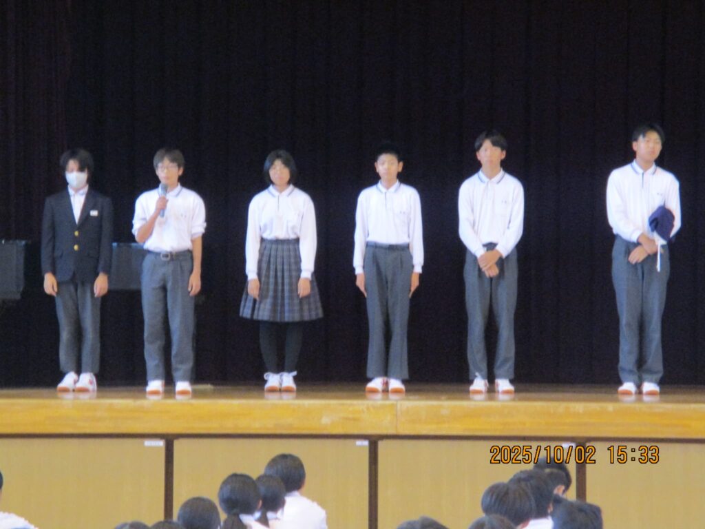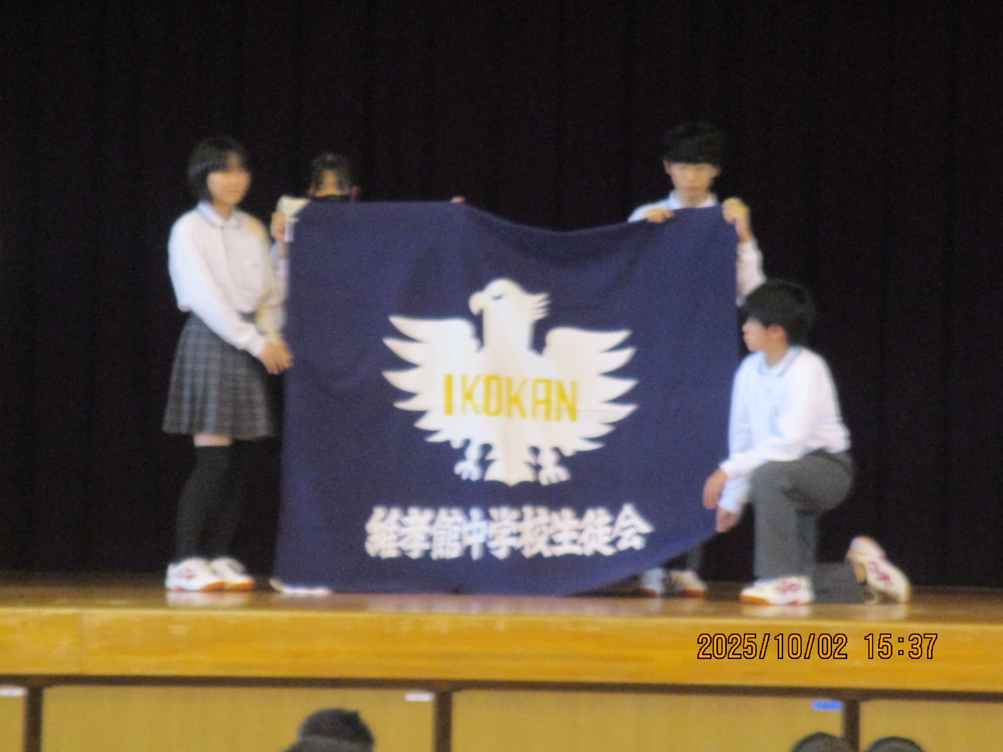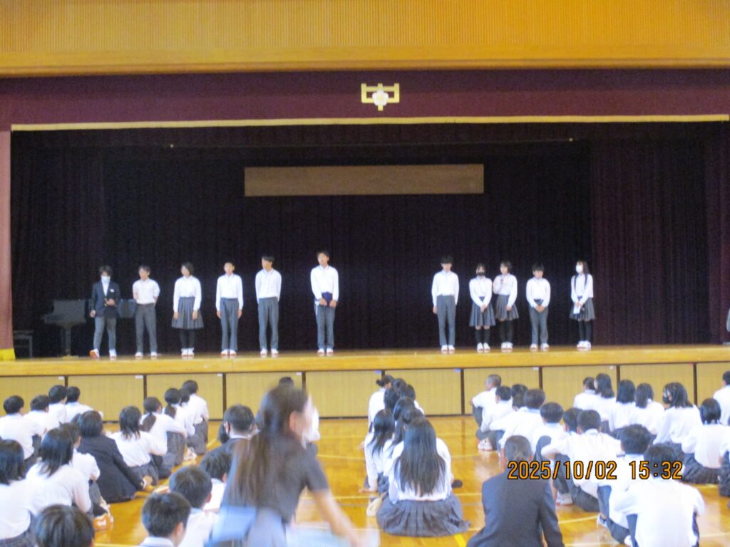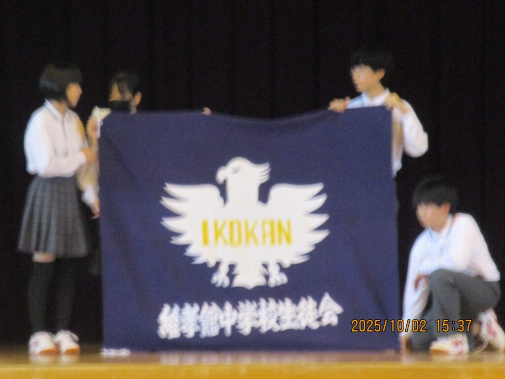 ようやく朝夕の気温が低くなり(といっても日中は30度近くありますが)幾分過ごしやすくなってきました。昨日で2学期中間テストも終わり、1年の後半がスタートしました。さて、先週の木曜日に新旧生徒会の引継式を行いました。引継式では、1年間「Non-S Top」のスローガンのもと力を尽くした旧本部役員のみなさんが一人一人、1年間の取組の成果や今後の学校への思いを話してくれました。その後、新本部役員のみなさんが一人一人、今後頑張っていきたいことやどんな学校にしたいかについて、決意とともに話してくれました。みんなが楽しく過ごせ、一人一人の居場所や活躍できる場面がある学校にするためには、生徒会本部役員の力だけではなく208人の生徒全員が力を合わせて考え、取組を進めていくことが必要です。また、教職員も生徒の考えをよく聞き、一人一人に応じた支援をしていきたいと思っています。スマイルがあふれ、みんなが輝く維孝館中学校を一緒につくっていきたいと思っています。新生徒会のスローガンは「破顔一笑 explore & change 」です。学校全員の笑顔が見られるように探求し続けるとともに、様々なことにみんなで挑戦していきましょう!