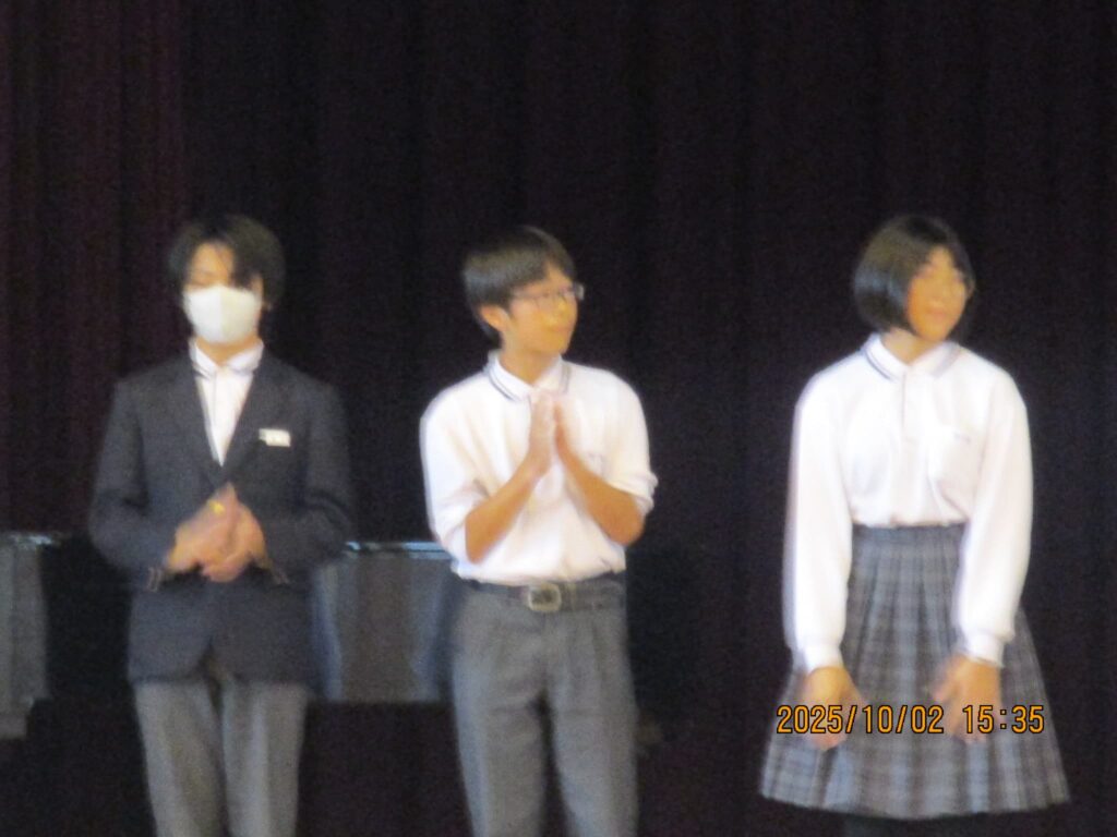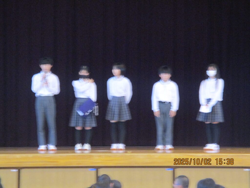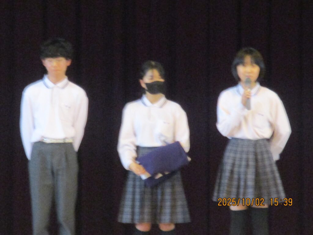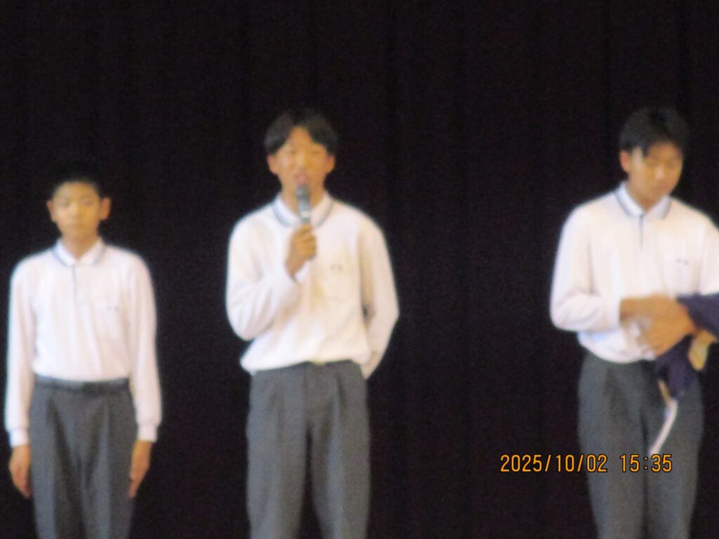 ようやく朝夕の気温が低くなり(といっても日中は30度近くありますが)幾分過ごしやすくなってきました。昨日で2学期中間テストも終わり、1年の後半がスタートしました。さて、先週の木曜日に新旧生徒会の引継式を行いました。引継式では、1年間「Non-S Top」のスローガンのもと力を尽くした旧本部役員のみなさんが一人一人、1年間の取組の成果や今後の学校への思いを話してくれました。その後、新本部役員のみなさんが一人一人、今後頑張っていきたいことやどんな学校にしたいかについて、決意とともに話してくれました。みんなが楽しく過ごせ、一人一人の居場所や活躍できる場面がある学校にするためには、生徒会本部役員の力だけではなく208人の生徒全員が力を合わせて考え、取組を進めていくことが必要です。また、教職員も生徒の考えをよく聞き、一人一人に応じた支援をしていきたいと思っています。スマイルがあふれ、みんなが輝く維孝館中学校を一緒につくっていきたいと思っています。新生徒会のスローガンは「破顔一笑 explore & change 」です。学校全員の笑顔が見られるように探求し続けるとともに、様々なことにみんなで挑戦していきましょう!