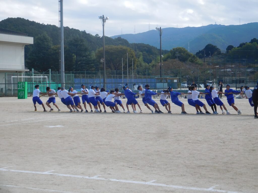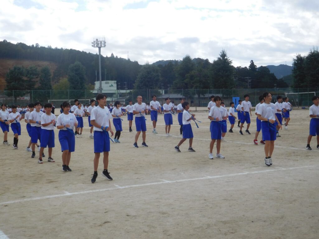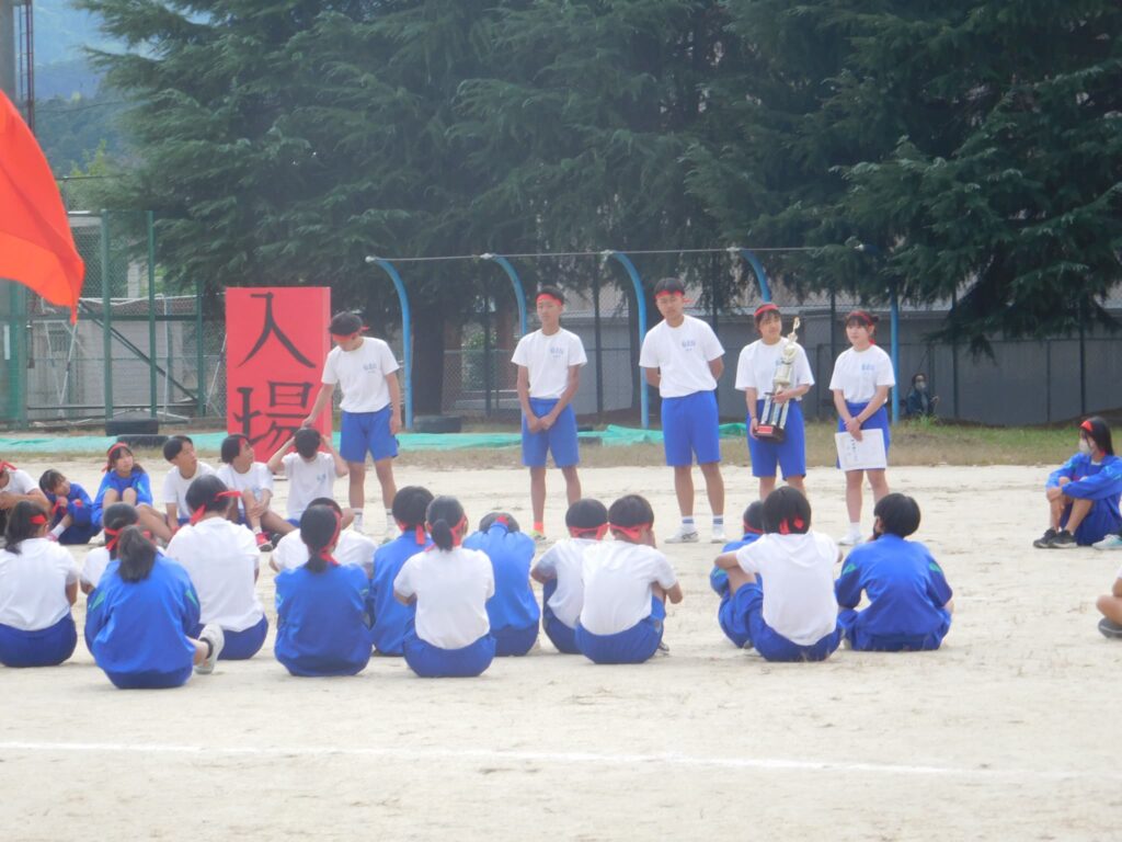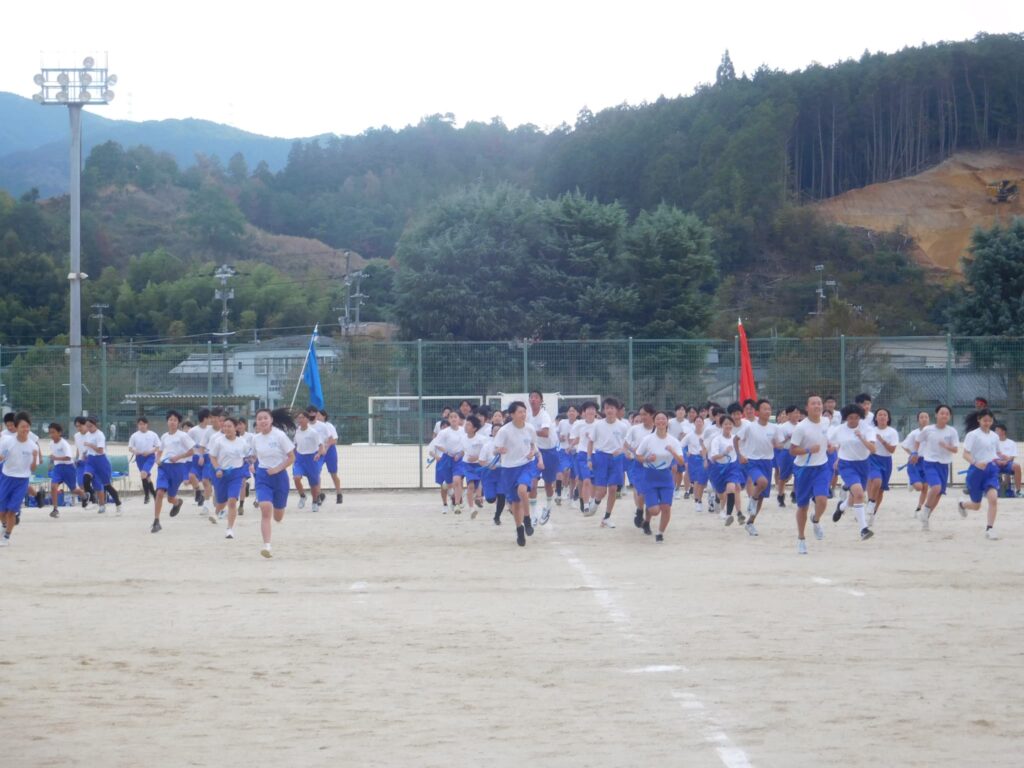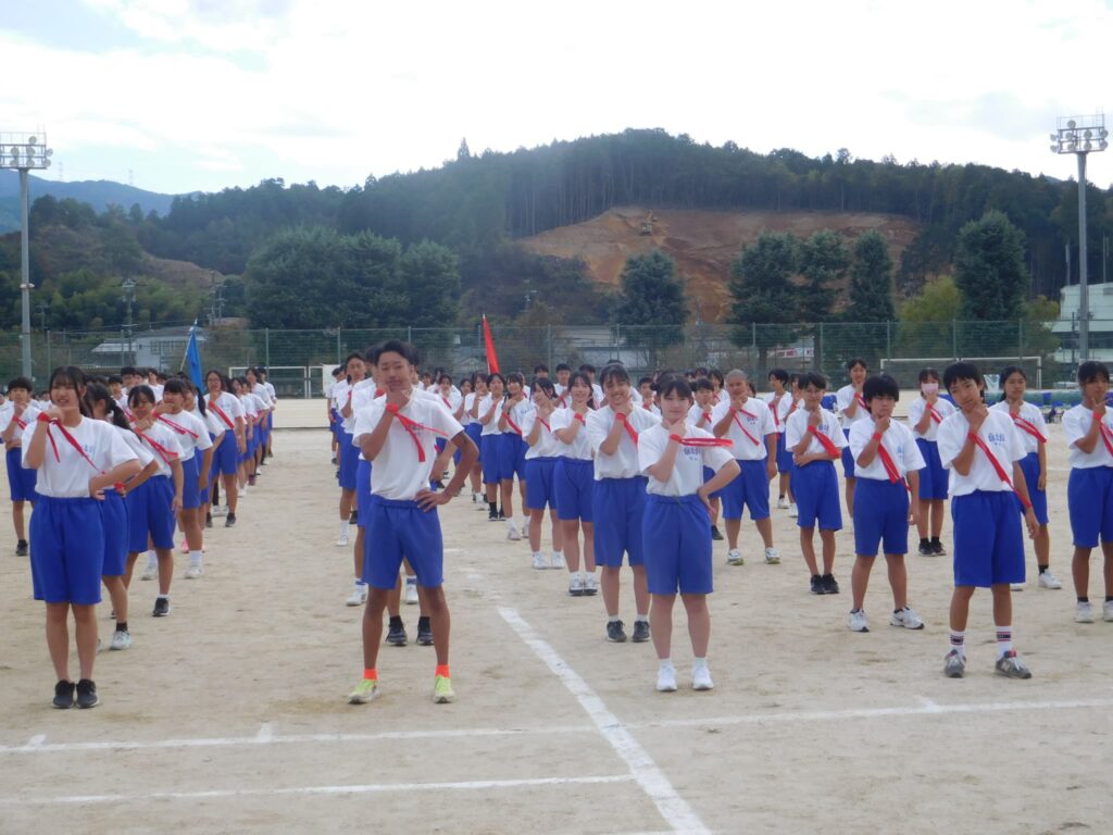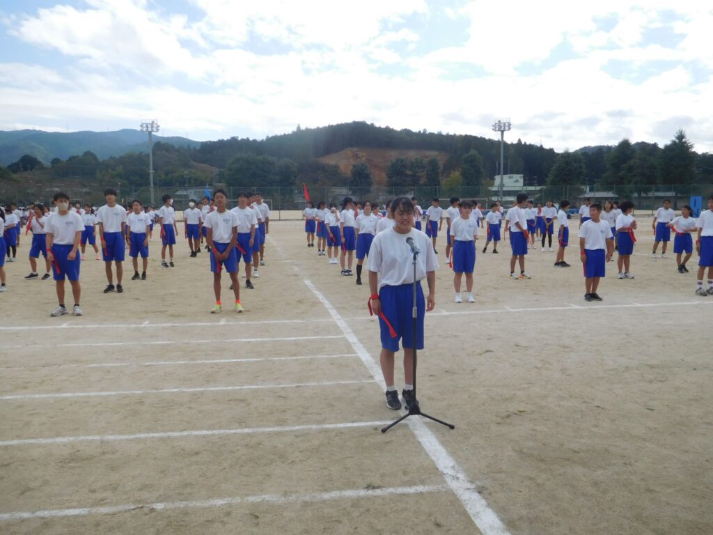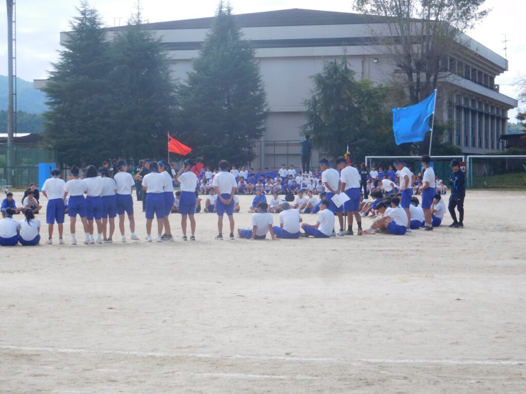 先週の金曜日(10/24)にさわやかな秋風の下、第77回体育大会を実施しました。赤・青どちらのブロックも全力を尽くし、全校スローガンの「混紡 ~ブロックの色に染まれ!」のとおり一人一人がブロックのために全力を尽くし、一人一人の頑張りが織り混ざり素晴らしい体育大会を紡ぎ出すことができました。各学年が練習を重ねた学年種目、各ブロックで作戦を考えたりやり方を工夫したりしたブロック種目(ハリケーン・綱引き)、また、ブロッ演技では、どちらのブロックも、毎日、練習を積み重ねブラッシュアップした成果が発揮されました。みんなが笑顔で切れ味鋭いダンスを披露している姿を見て、とても感動しました。この日のために、夏休みから取り組みを進めた3年生のリーダーの皆さん、生徒会本部の皆さん、1・2年のリーダーの皆さん、グラウンドの準備や当日の運営についてしっかりと責任を果たした各係や委員会の皆さん、そして競技や応援に全力を尽くしたすべての生徒のみなさんの力で笑顔(スマイル)いっぱいの素晴らしい体育大会になったことをうれしく思いました。運営にご協力いただいたPTA本部役員・保健体育部員の皆様方、ありがとうございました。また、ご観覧いただいたご来賓の皆様、保護者の皆様、地域の皆様方の子どもたちへの温かいご声援、励ましの拍手に感謝の気持ちでいっぱいです。どうもありがとうございました。