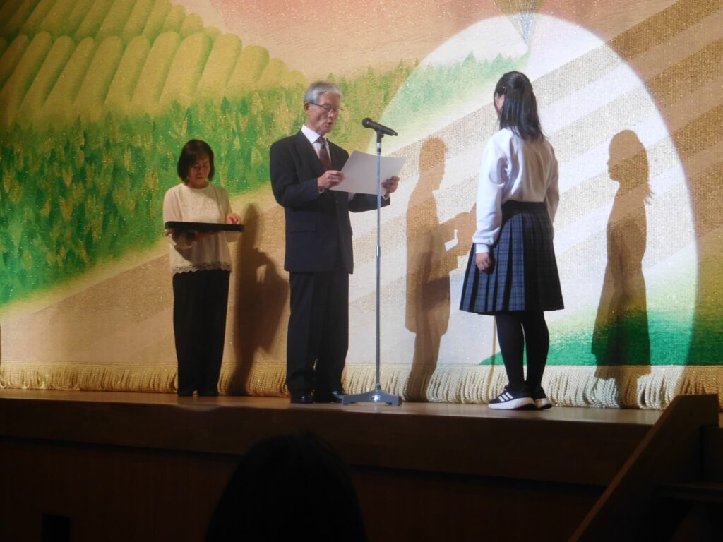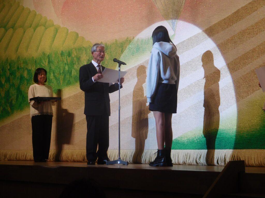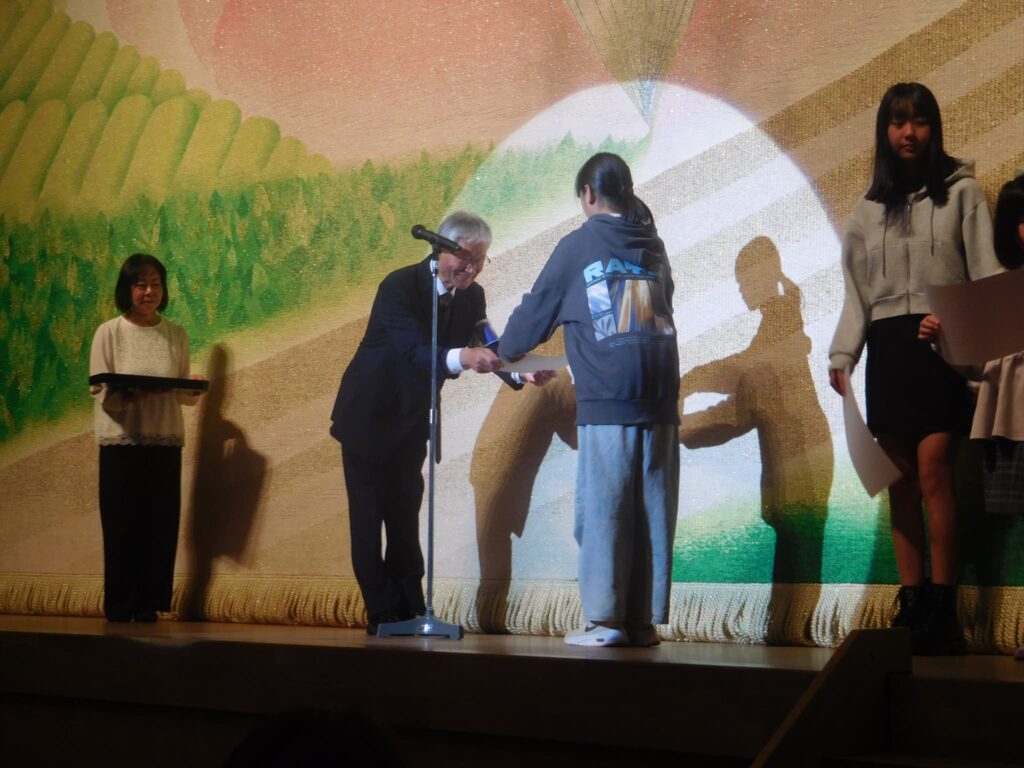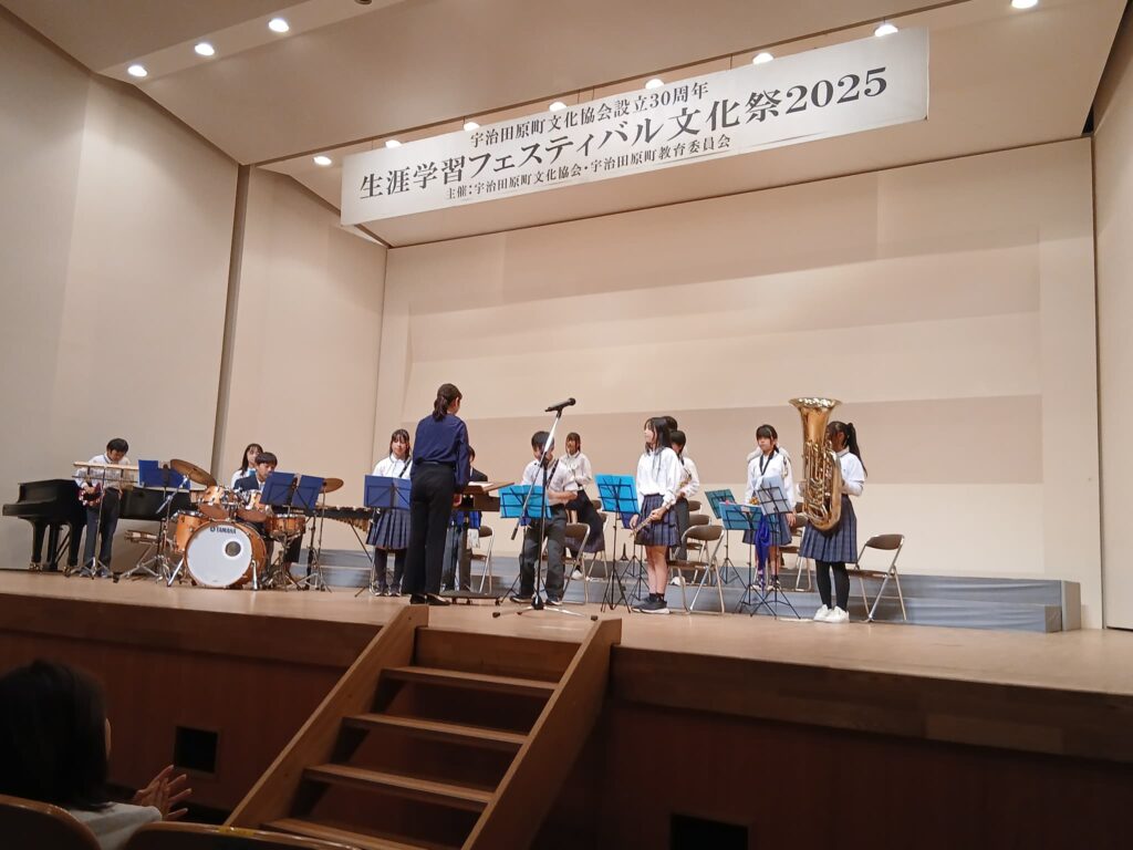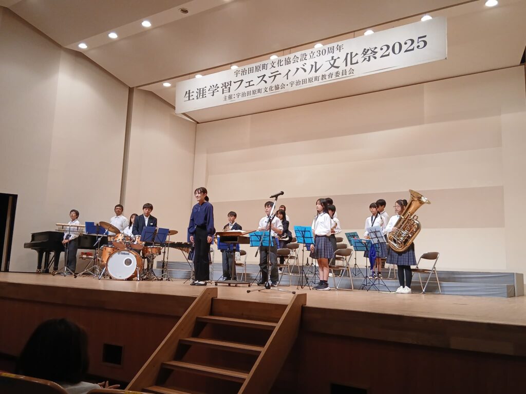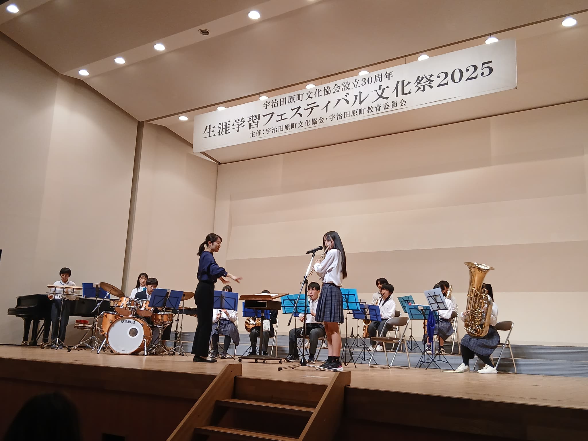 10月25日(土)に町総合文化センターで開催された町生涯学習フェスティバル文化祭2025において多くの本校生徒が活躍しました。プログラム表紙コンクールでは優秀賞に太田さん(1年)、佳作に京谷さん(1年)、辻井さん(1年)が輝き、開会式で表彰されました。おめでとうございます。続いて行われたコンサートでは吹奏楽部の1、2年生が「パプリカ」「学園天国」「マツケンサンバ」など4曲を演奏しました。9月で3年生が引退した中、初めての大舞台となりましたがみんなで力を合わせ素晴らしい演奏をし、聴衆を大いに盛り上げてくれ、会場は大きな拍手に包まれました。11月3日(文化の日)には、町商工祭での演奏もあります。吹奏楽部の演奏を皆さんぜひ聞きに来てください。