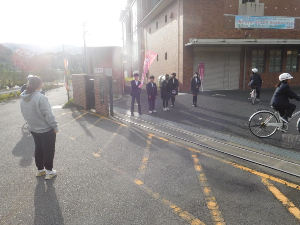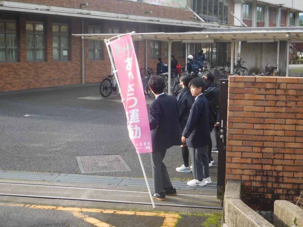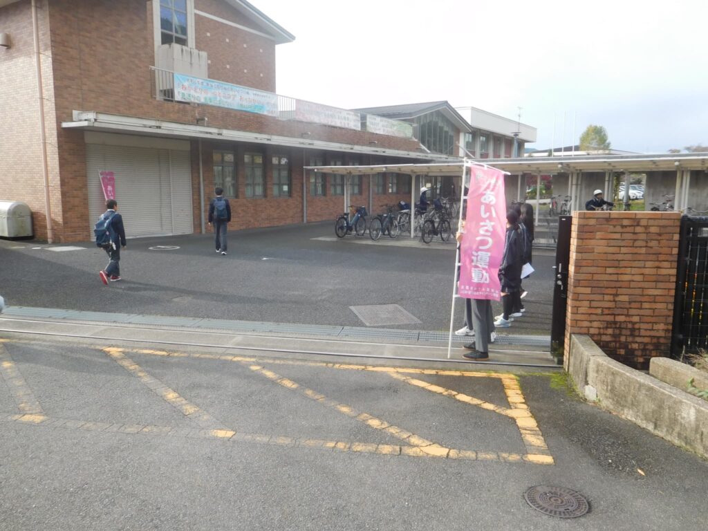 本日の朝、本校東門前で町社会教育委員の皆様とPTA本部役員の皆様にお越しいただき、合同のあいさつ運動を実施しました。また今回は、新生徒会本部役員の皆さんも一緒に参加してくれました。気持ちの良いあいさつで一日のスタートを切ることは、お互いのコミュニケーションを図ったり、「今日もがんばるぞ」という気持ちになったりするのにとても大切なことです。気持ちの良いあいさつと笑顔(スマイル)の輪が広がるように今後もこの取組を継続していきたいと思っています。本日参加していただいた皆様、新生徒会本部役員のみなさん朝のお忙しい中、どうもありがとうございました。今後も引き続きよろしくお願いします。次回のあいさつ運動は11月20日(木)に計画しています。皆様、よろしくお願いします。