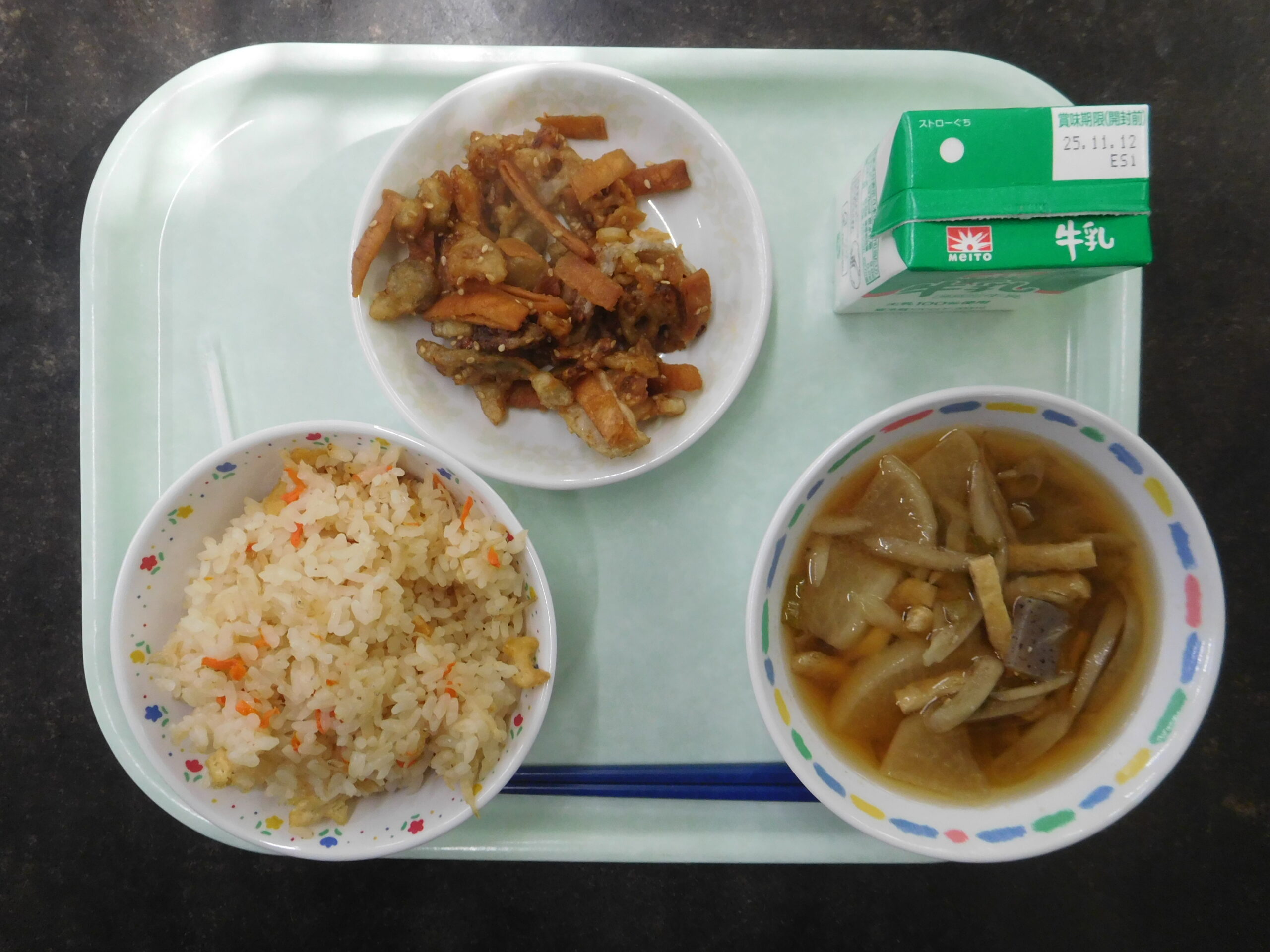 明日、11月8日は「いい歯の日」です。それにちなんで今日の給食は、よくかんで食べてほしい「かみかみ」献立でした。「根菜と板ふのかみかみ和え」は、板ふやごぼう、れんこんを油で揚げ、手作りの甘辛いタレと絡めて仕上げられていました。ごぼうとれんこんは、秋から冬にかけて旬を迎える野菜です。根の部分を食べる「根菜」は、食物せんいが豊富で、お腹の調子を整えてくれる効果もあるそうです。丈夫な歯をつくるようにごはんやみそ汁と一緒によくかんで食べるようにしましょう。いつも季節や行事にあった栄養満点で美味しいメニューを作ってくださる町共同調理場の皆様ありがとうございます。