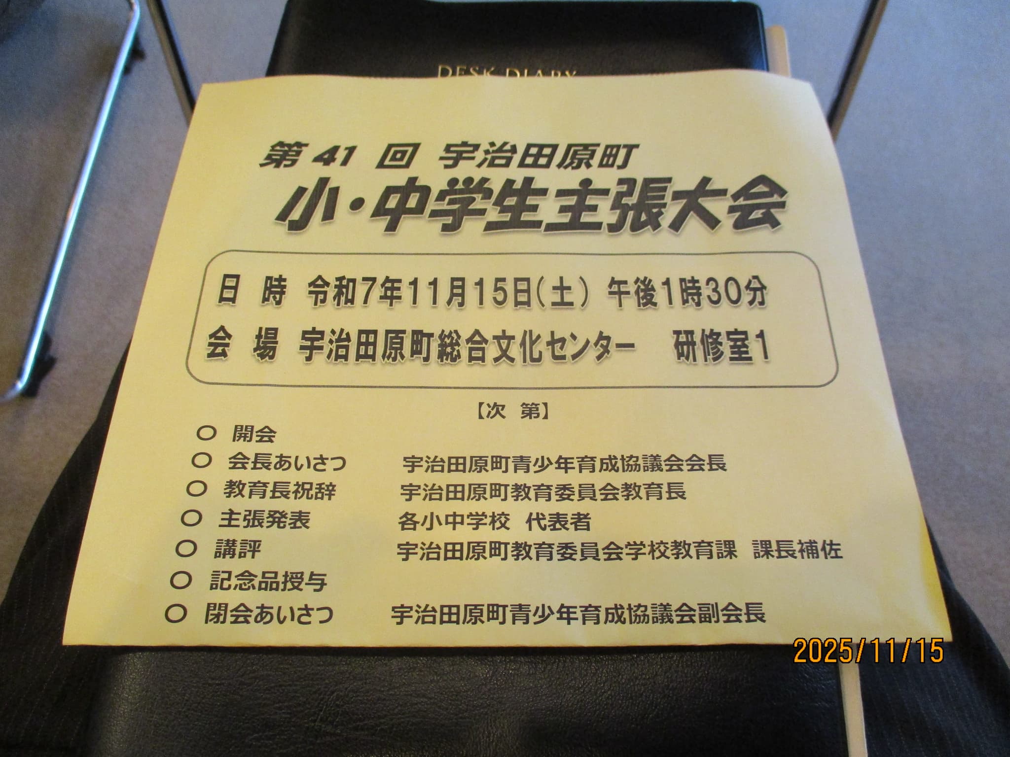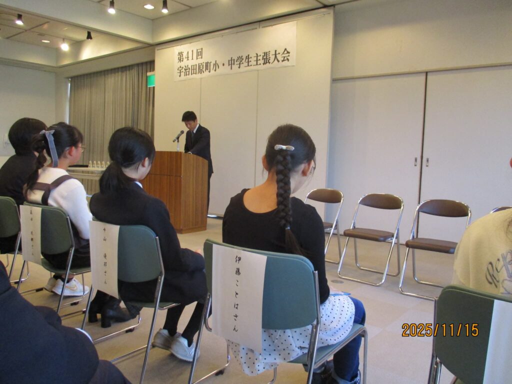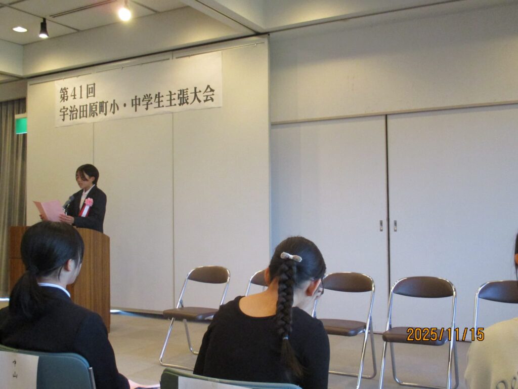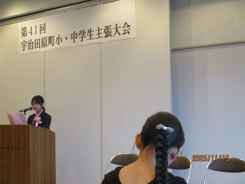 11月15日(土)に町総合文化センターで町青少年育成協議会主催の第41回宇治田原町小・中学生主張大会が開催されました。町内各小中学校から2名の児童生徒が発表し、本校からは中山さん(2年)が「高齢者の運転と生活」を、古川さん(2年)が「あの頃のつながりをもう一度」を発表しました。主張発表した6名ともに社会で起こっている様々な出来事や日頃感じていることを自分の体験や考えに基づき、思いを込めて落ち着いた様子で発表している姿が印象的でした。聞いていた私も思わずうなずいたり、自分の今までの行動を振り返り、考えさせられたりすることが多くありました。発表した6名の皆さん、大勢の方々の前にもかかわらず、堂々とした態度で、素晴らしい発表をありがとうございました。
