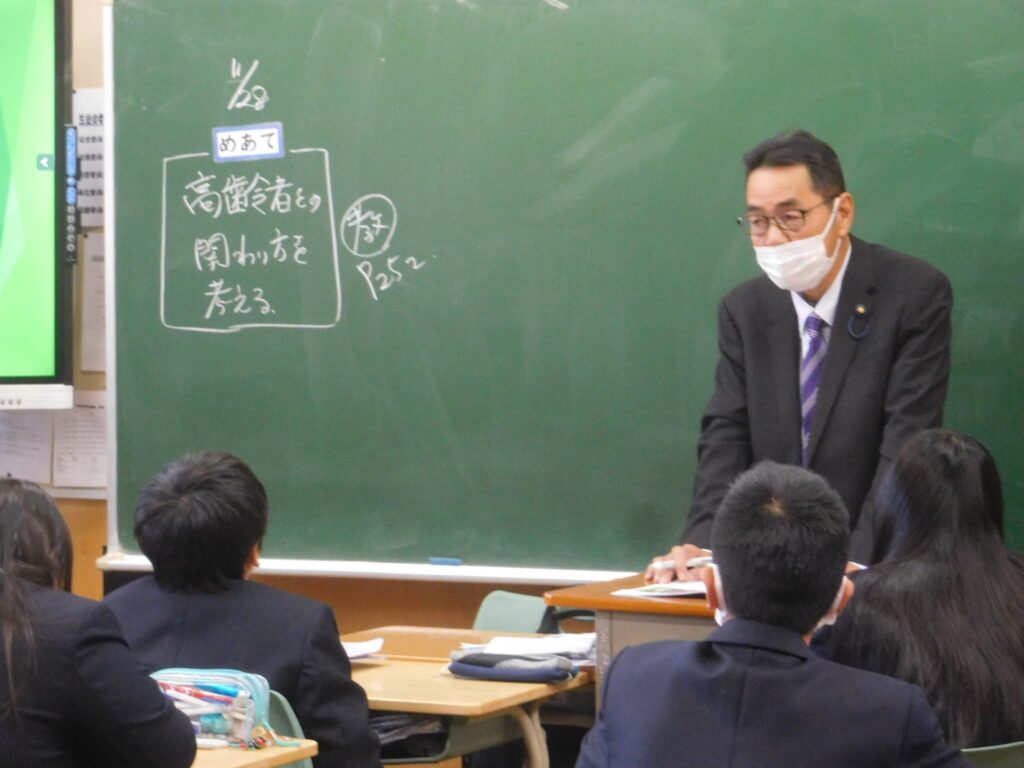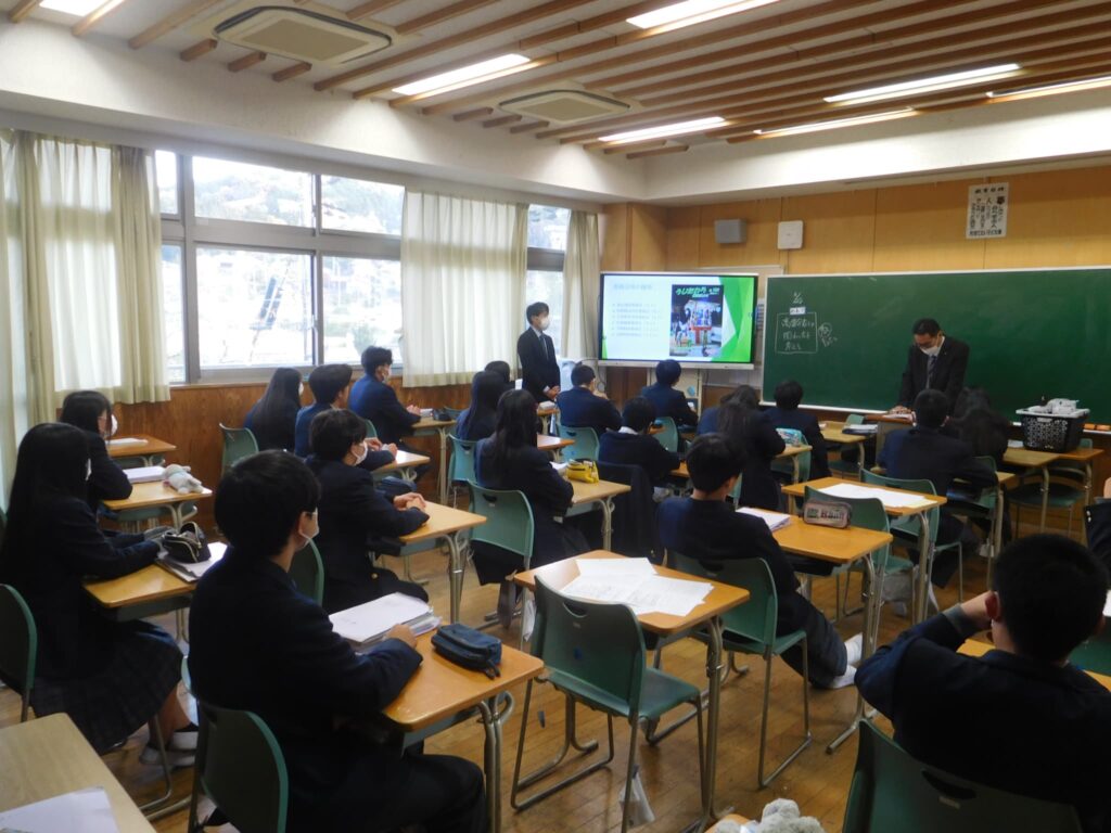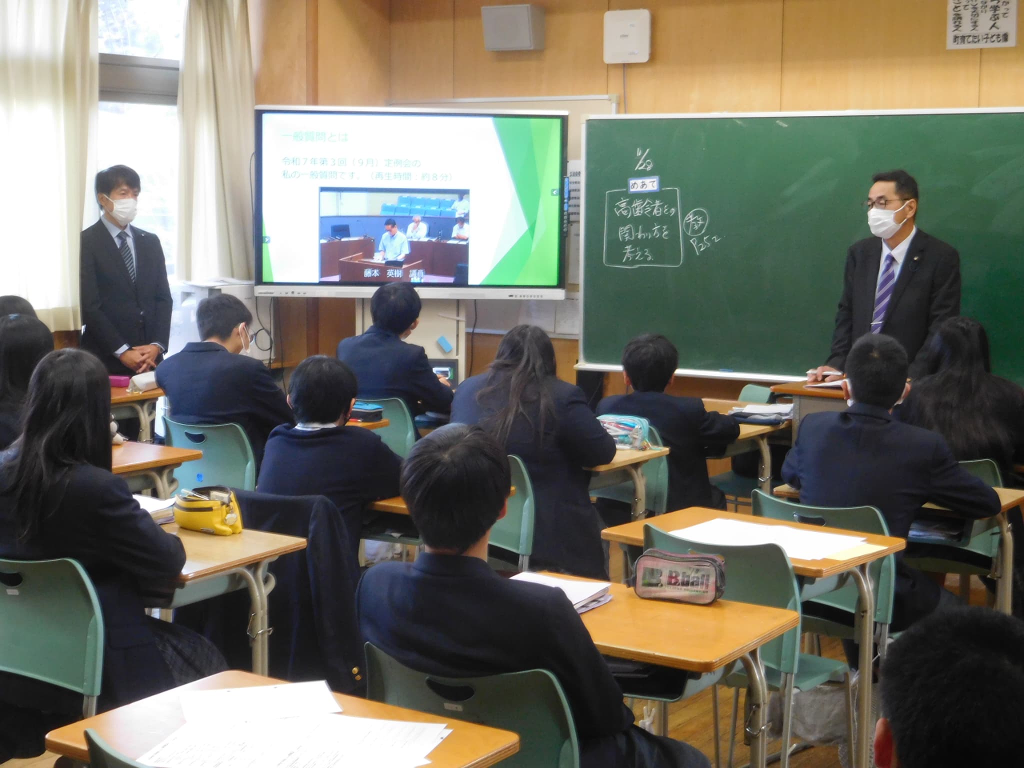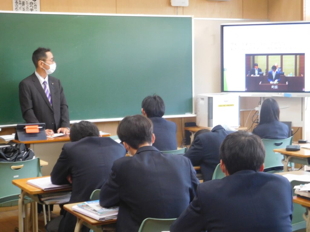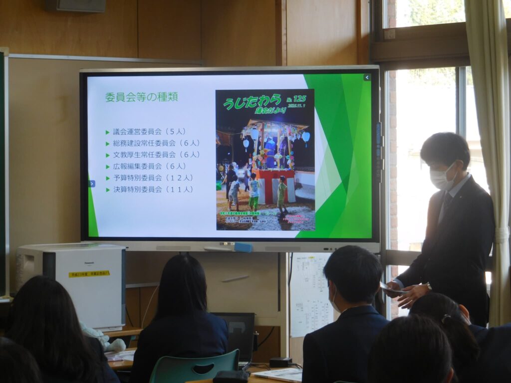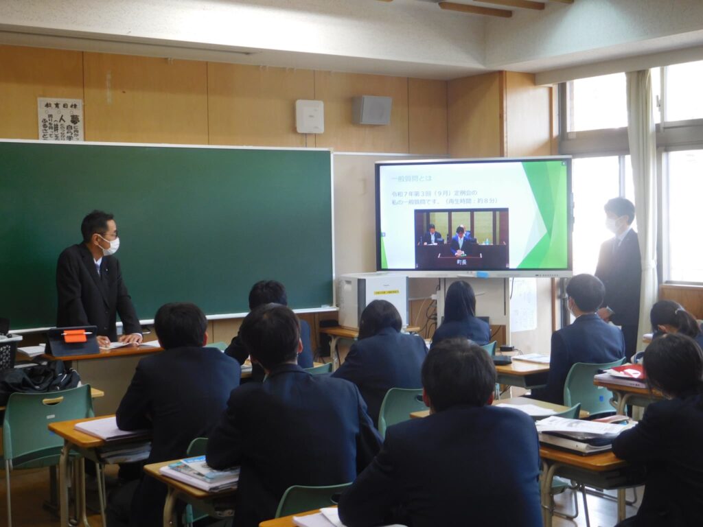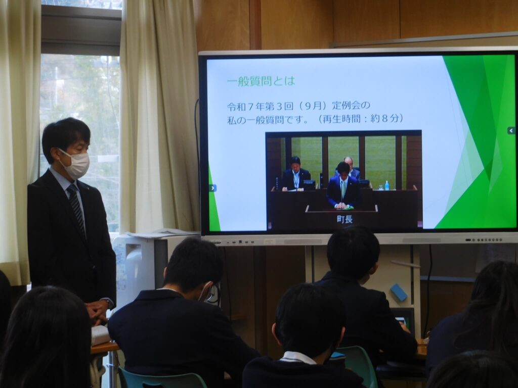 12月19日(金)に町議会の議場で開催される「中学生議会」に向けて、本日、町議会議員の藤本議員と谷口議員、町議会事務局の西尾局長にお越しいただき、事前出前講座を実施しました。中学生議会のねらいは、「1月に『まちづくり学習』を行う3年生徒が、議場を見学すると共に、議員となって質問を行うことにより、地方自治のしくみを理解し、宇治田原町のまちづくりを考える場とする」で、毎年3年を対象に実施しています。この日は、藤本議員と谷口議員により町議会議員の選出、議会の権限、議会の活動や定例会の流れ等をパワーポイントや動画を使い、ていねいに分かりやすく説明していただきました。みんな熱心に話を聞き、実際の議場の様子をイメージしたり、当日の質問を考えたりできたことと思います。12月19日(金)当日には各クラス12人の中学生議員と傍聴者に別れ、5名の中学生議員がみんなで考えた質問を行います。中学生が自分たちの町の現状や将来をどう考え、どんな質問が出るのか、今からとても楽しみです。本校にお越しいただいた藤本議員様、谷口議員様、西尾事務局長様、お忙しい中、お越しいただき、ありがとうございました。