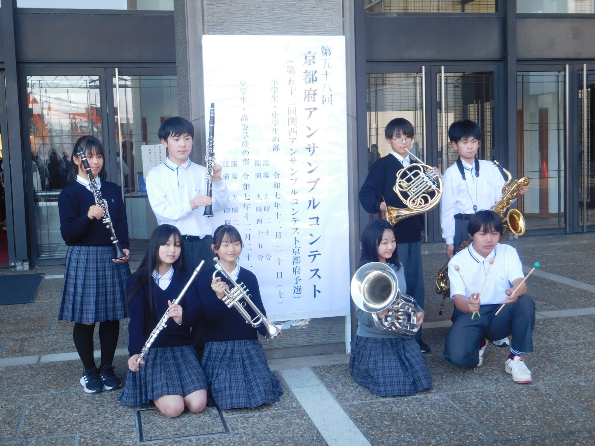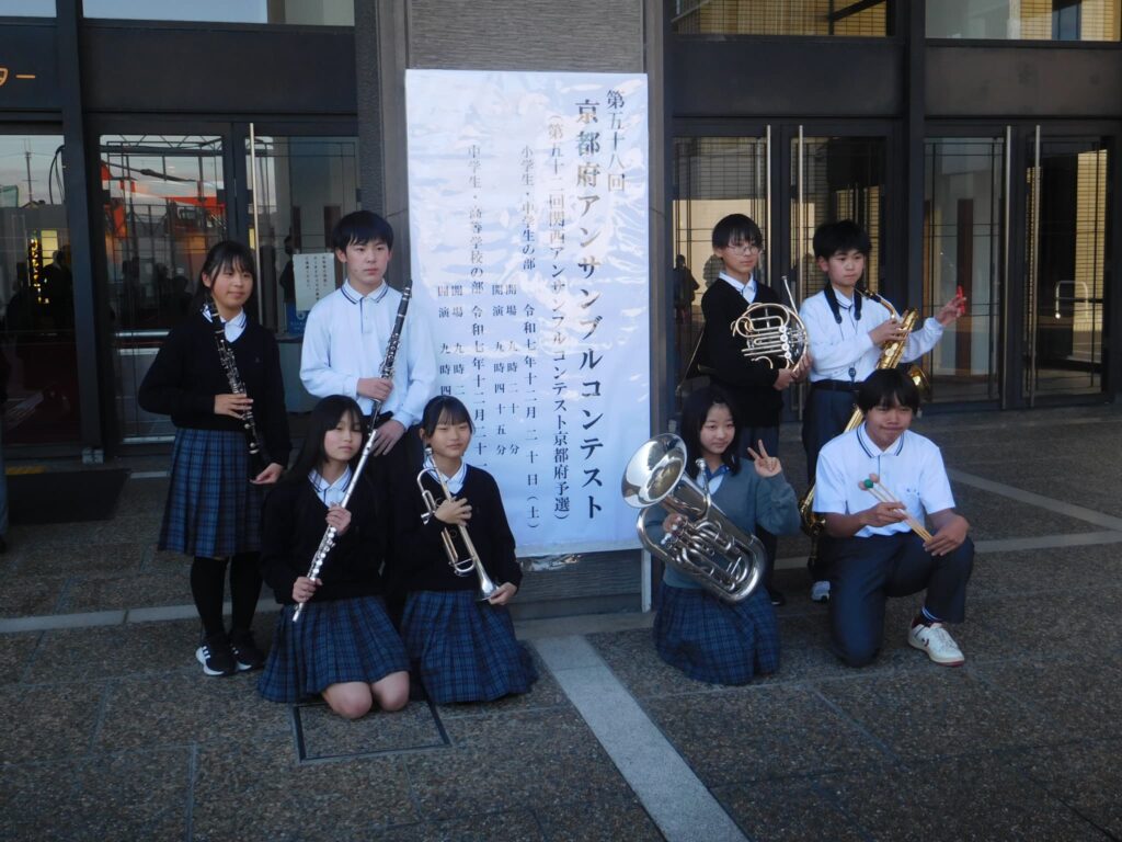 12月20日(土)八幡市文化センター大ホールで実施された第58回京都府アンサンブルコンテストに吹奏楽部の8名が参加しました。曲目は「風の詩」(作曲:福島弘和)で、管打8重奏での参加でした。普段の全員での演奏とは異なり、少人数での演奏のため、演奏前は少し緊張した様子でしたが、演奏が始まると8人の息もぴったり合って、気持ちを合わせたきれいなメロディが奏でられました。様々なホールや舞台を経験し、一つ一つの経験を糧に成長し、上達していく姿、演奏後の緊張から解放され達成感いっぱいの笑顔を目の当たりにして嬉しくなりました。演奏後は、大きな拍手が会場いっぱいに広がりました。