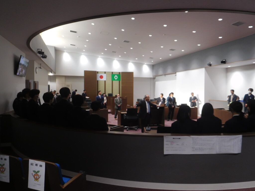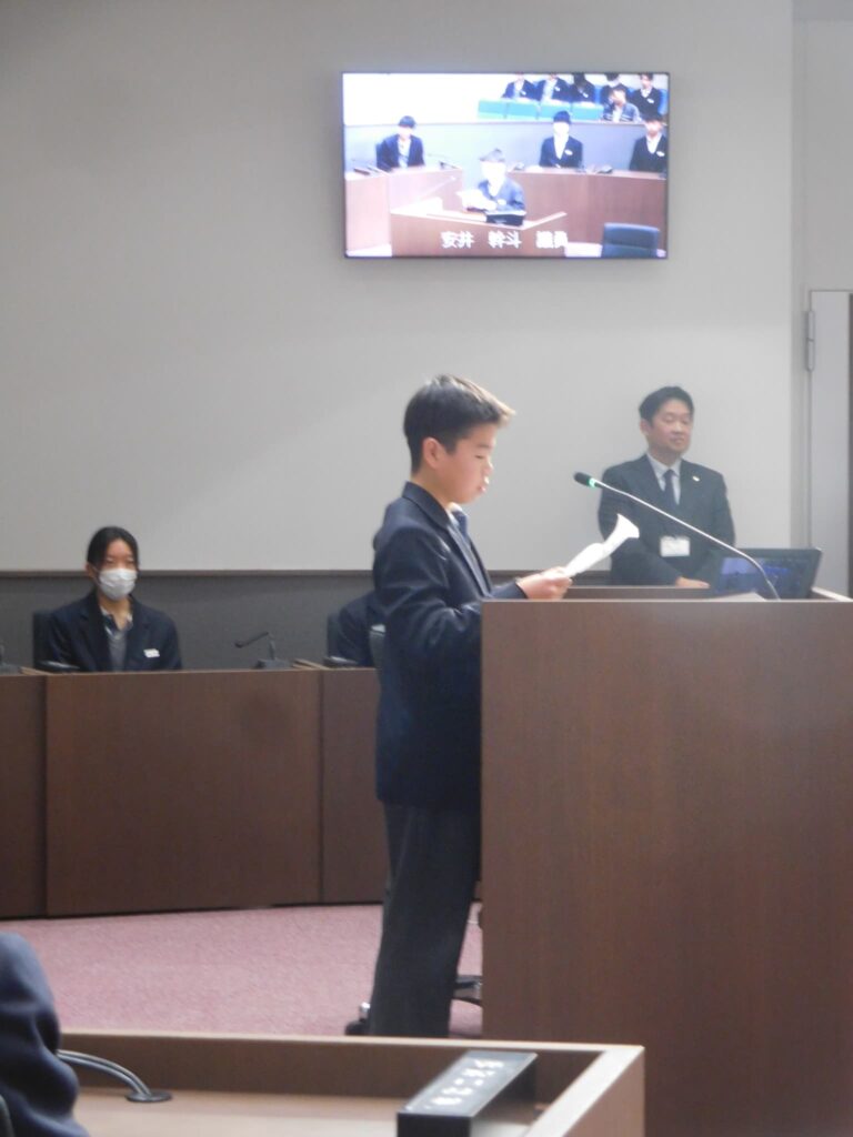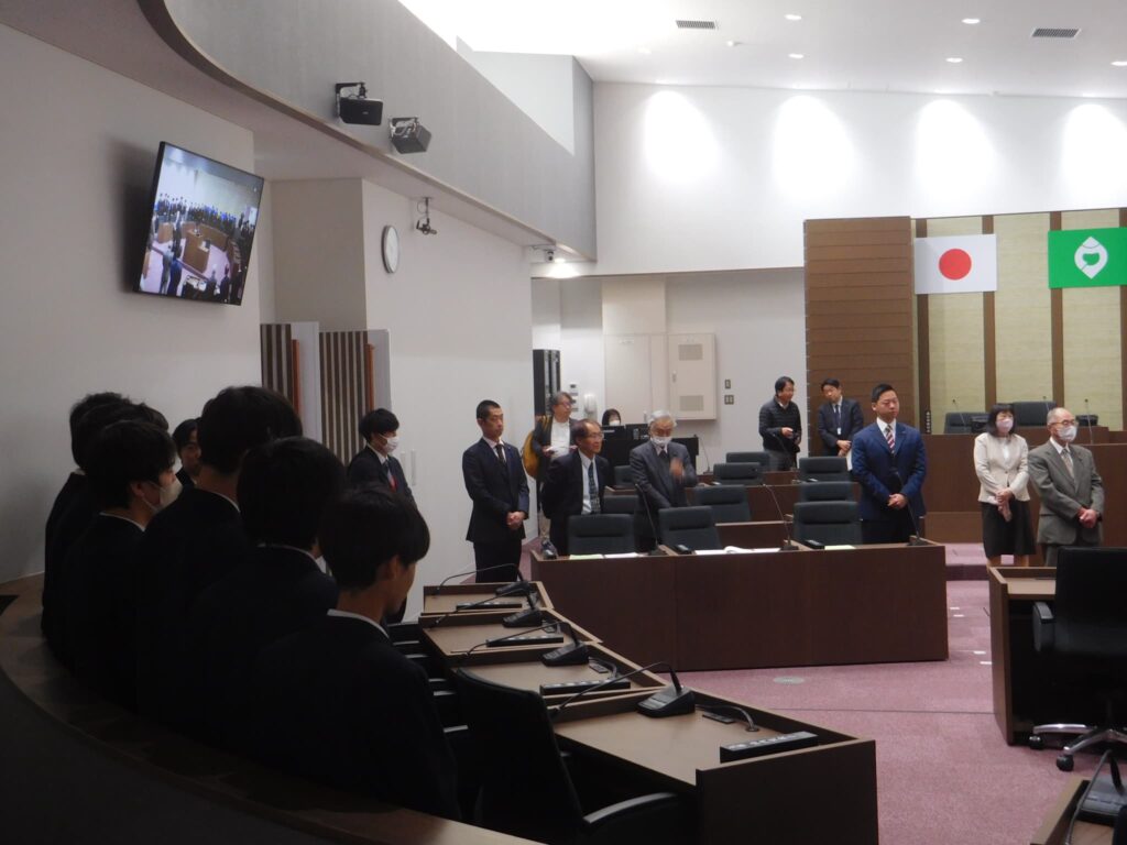 最初は緊張気味だった生徒たちも町議会議員さんの温かく優しいお声かけに表情も和らぎ、学級代表の中学生議員の皆さんも自分たちの思いを堂々と質問することができ、傍聴席の生徒たちも質問にうなずきながら大きな拍手を送っていました。