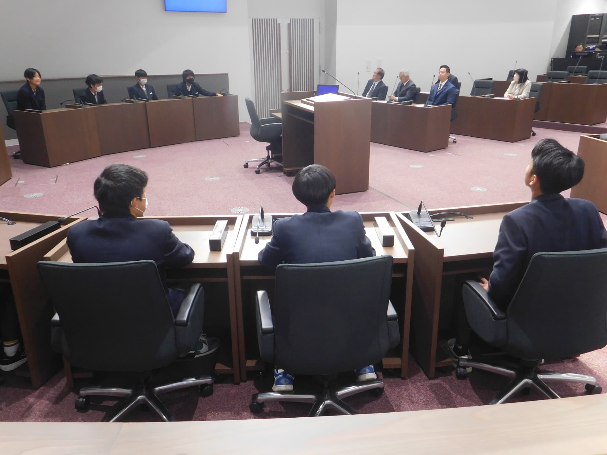 この日は、学級ごとに1時間ずつ町議会議員さんによる、開会あいさつ、町議会の説明、議長室・議場の見学、町政に対する中学生議員からの質問と町議会議員さんによる答弁、模擬表決、閉会あいさつと進みました。