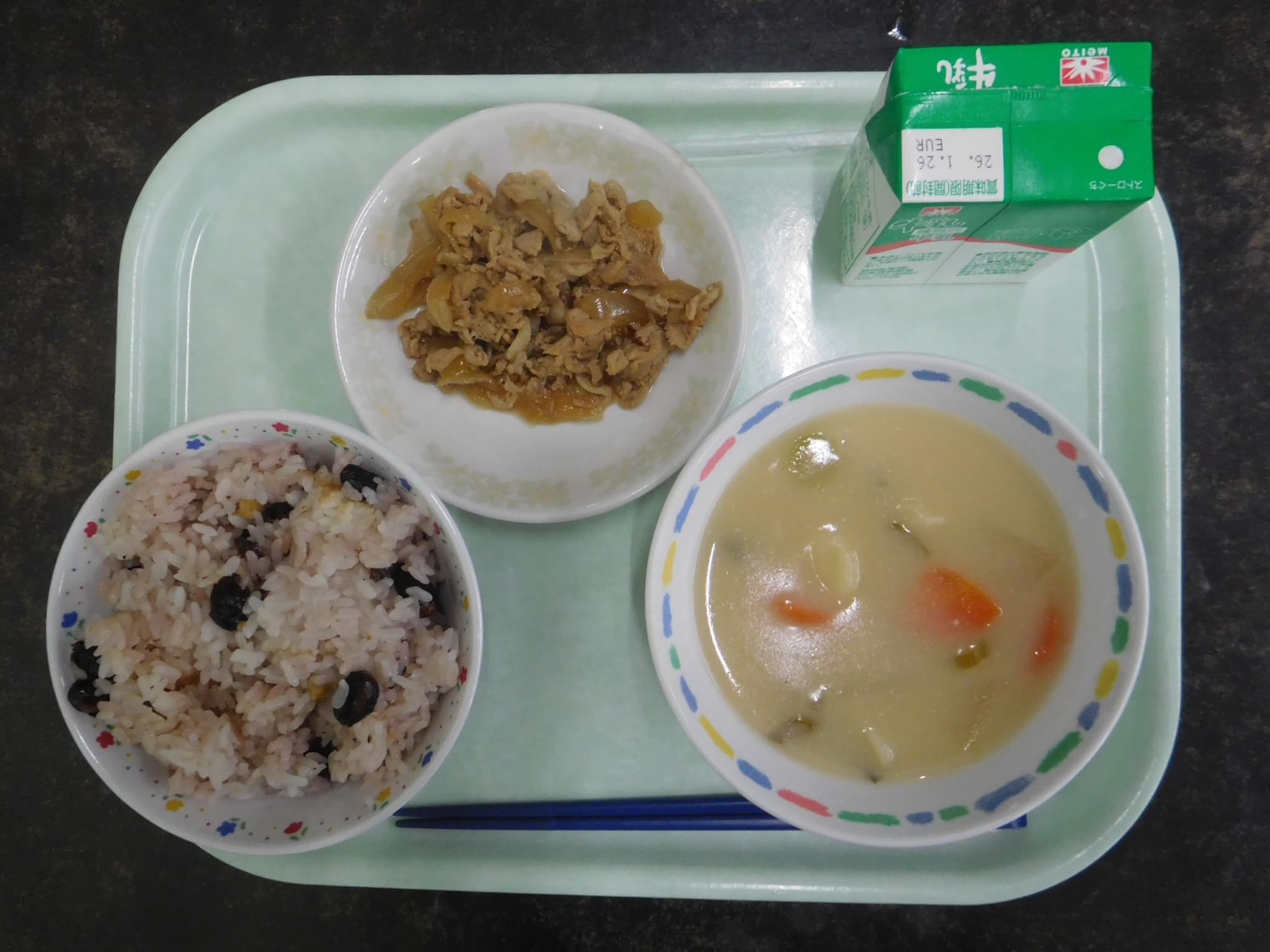 本日の給食は「黒豆ごはん」と「お雑煮(ぞうに)」でした。 日本のお正月にはお節料理を食べる風習があり、黒豆の煮物は定番の一品です。本日の給食では、米に黒豆と調味料を加えた炊き込みごはんが提供されました。お雑煮にはお餅、にんじん、たまねぎ、大根が入っていて、温かくてとても美味しく、お正月に家で食べたお雑煮を思い出しました。