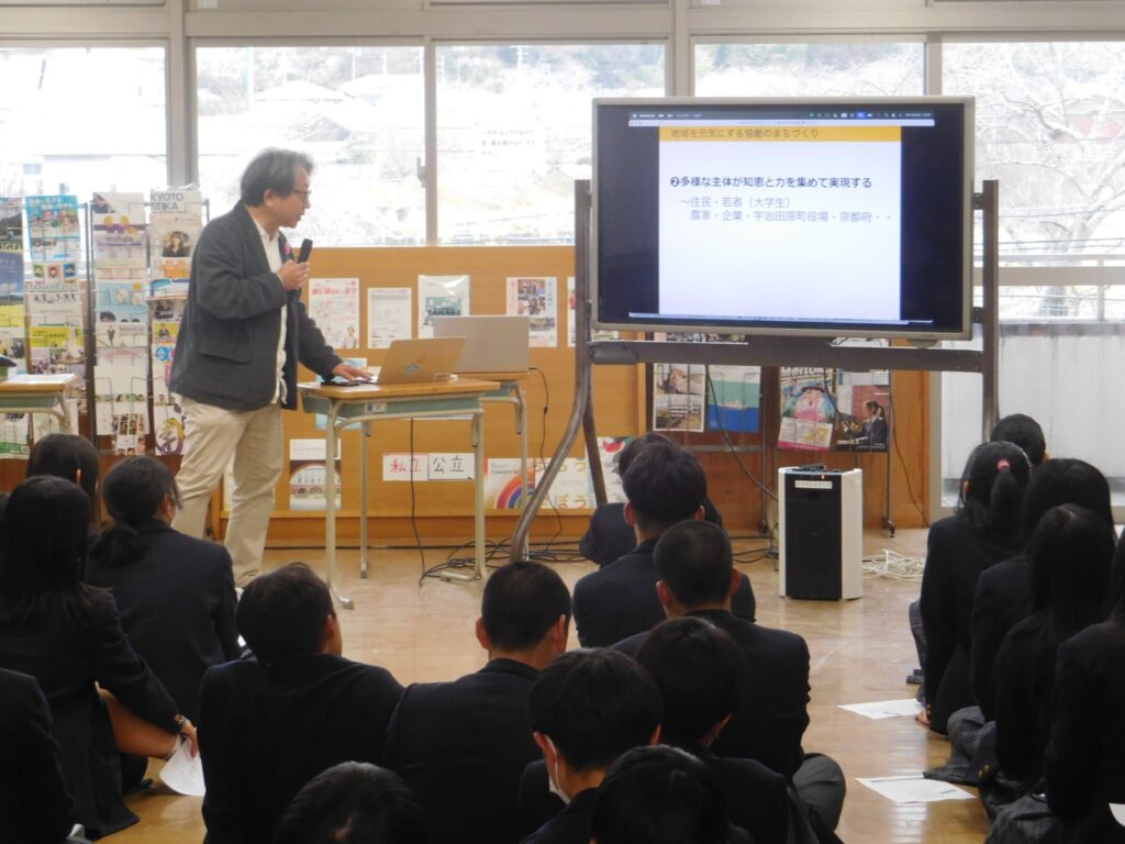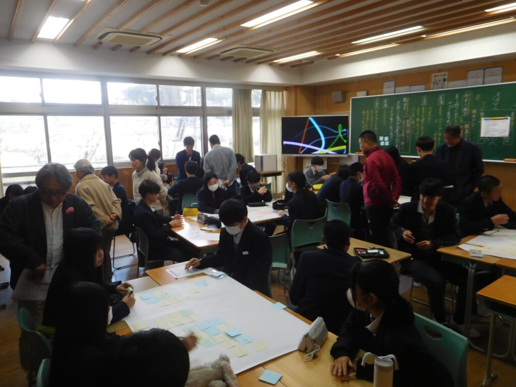 昨日(1/14(水))まちづくり学習「宇治田原を元気にする会社をつくろう!」の本年度第1回目の授業を3年で実施しました。この取組は平成23年度から続く取組で今回15回目となります。この取組は、本校生徒の宇治田原町に対する思いをこれからのまちづくりに生かしていこうというねらいで大学の先生や地域の方々、現在、高校生や大学生になっている本校卒業生が一緒になって地域づくりのワークショップを行うものです。