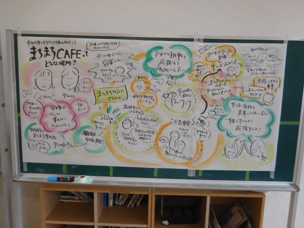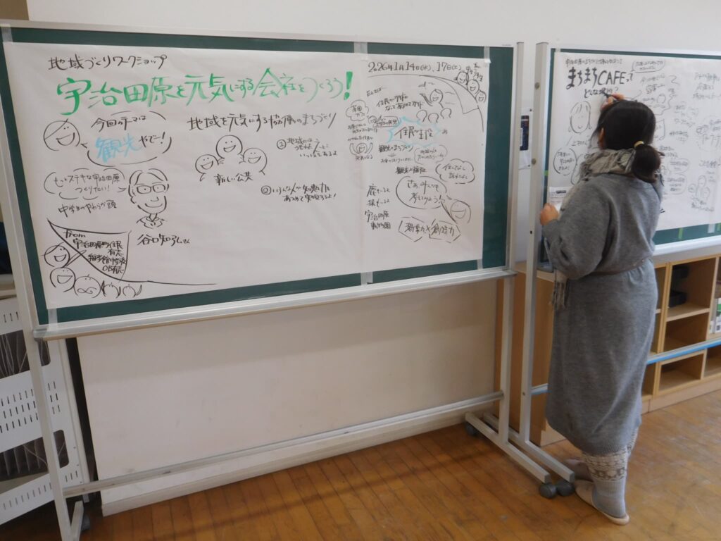 第1回目のこの日は、全体会で福知山公立大学の谷口教授からこの取組の趣旨や宇治田原町のまちづくりの取組について話していただき、続いて「まちまちCAFE」の活動をされている上村さん、中山さんから「まちまちCAFE」を立ち上げるまでの思いや取組の様子、感動したこと、喜びや苦労したこと等を語っていただきました。また、全体会の話はグラフィックファシリテーターの奥野さんに分かりやすい文章や図、イラストでまとめていただきました。