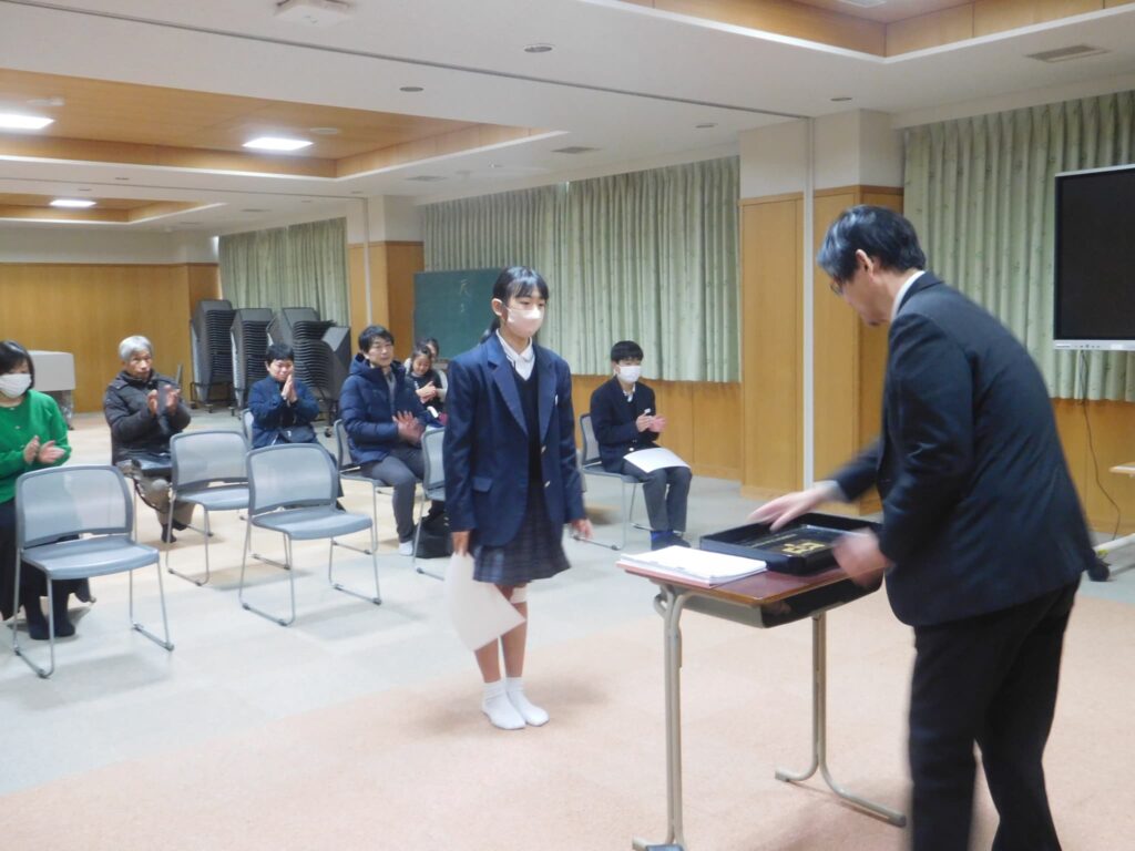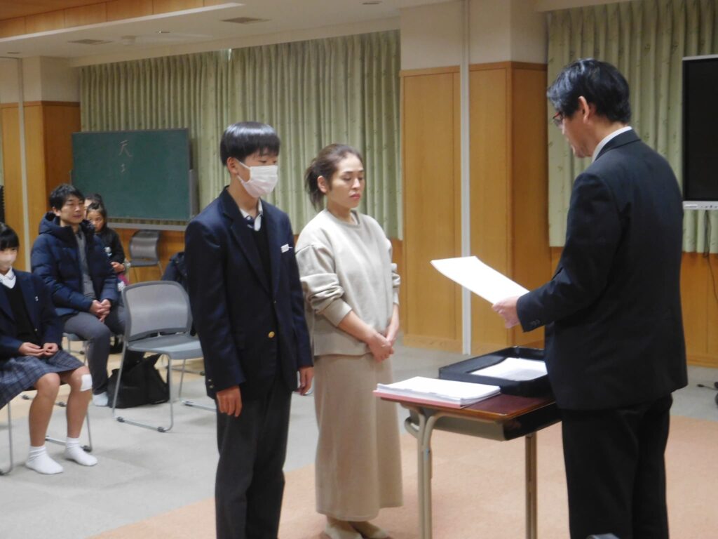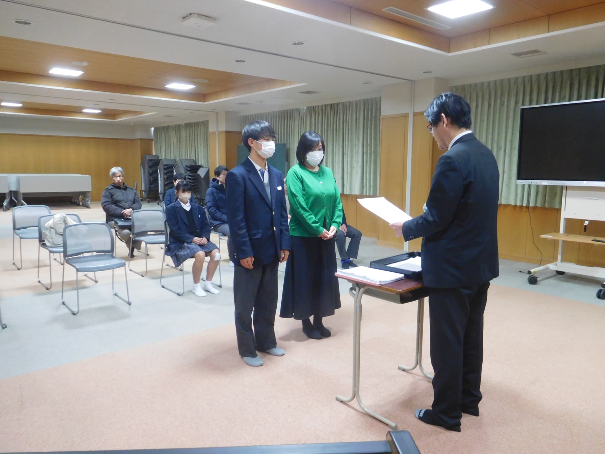 昼休みには「和みホール」で昨年11月から12月にかけて実施したPTA主催「家族で取り組むあいさつ川柳」入選作品表彰式を開催しました。どの作品もご家庭での温かい情景が目に浮かび、親子の絆やご家族の結びつきが感じられ、思わず微笑んだり感心したりしました。入選者の皆様には賞状と副賞をお贈りするとともに、今年度の金賞作品は、東門横の校舎2階に横断幕にして掲示する予定です。入選者の皆様おめでとうございました。