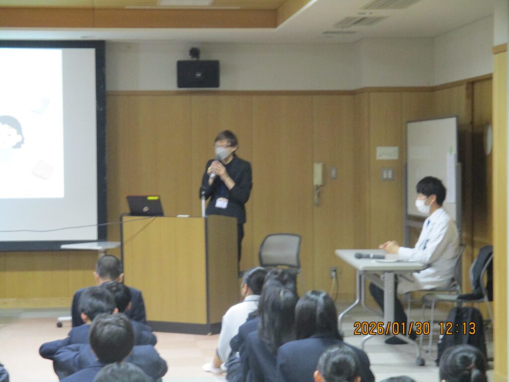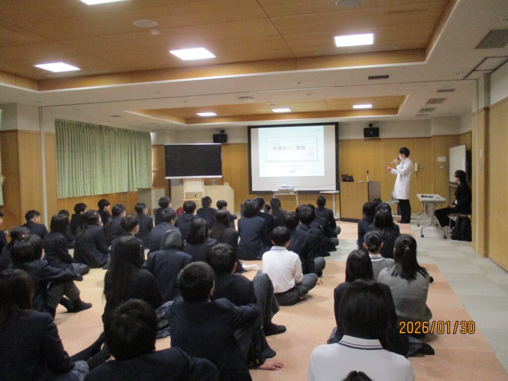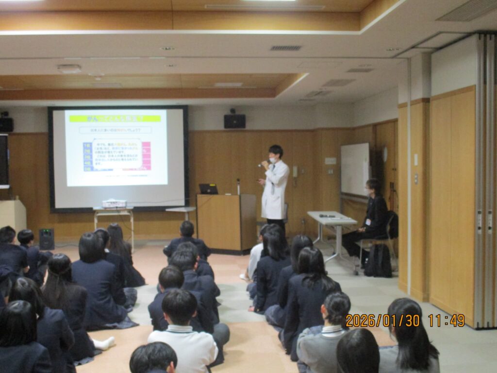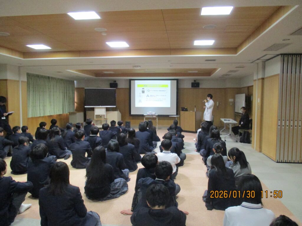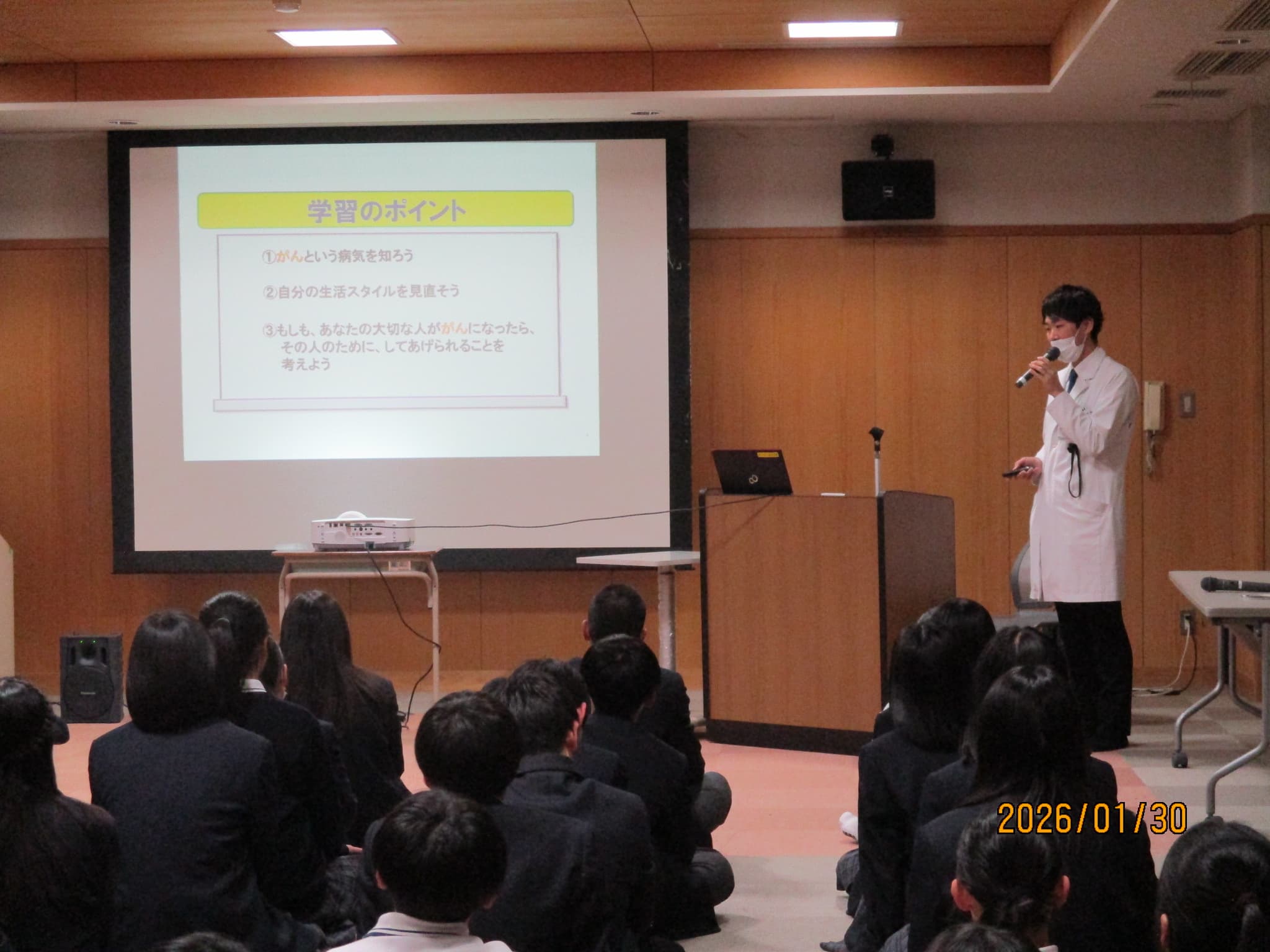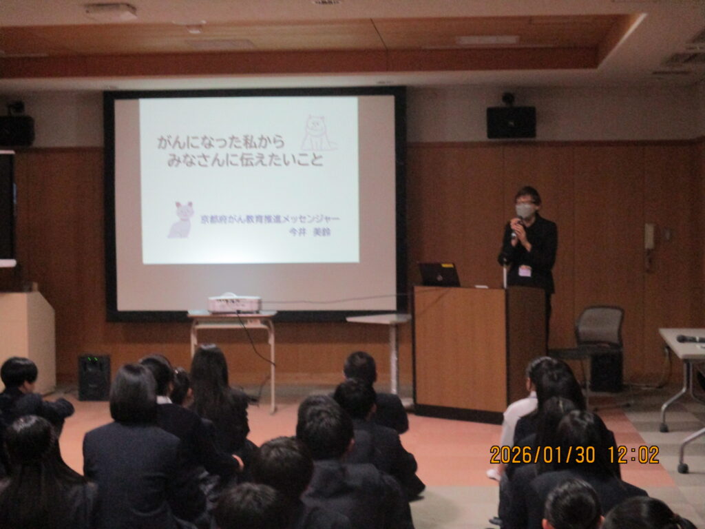 先週の金曜日(1/30)、和みホールで2年が総合的な学習の時間に「生命(いのち)のがん教育」を実施しました。この事業は、京都府健康福祉部健康対策課がん対策係が、がん対策推進計画に基づき、がんに関する正しい理解の普及やがん患者の方に対する偏見をなくすために、「がんという病気を知り、自分の生活スタイルを見直す」、「大切な人ががんになった時、自分ができることを考える」等、がんの病態や予防等に関する教育・普及啓発をねらいとして平成25年度から学校や企業を対象に実施しているものです。本校でも毎年2年生徒を対象に授業に来ていただいています。