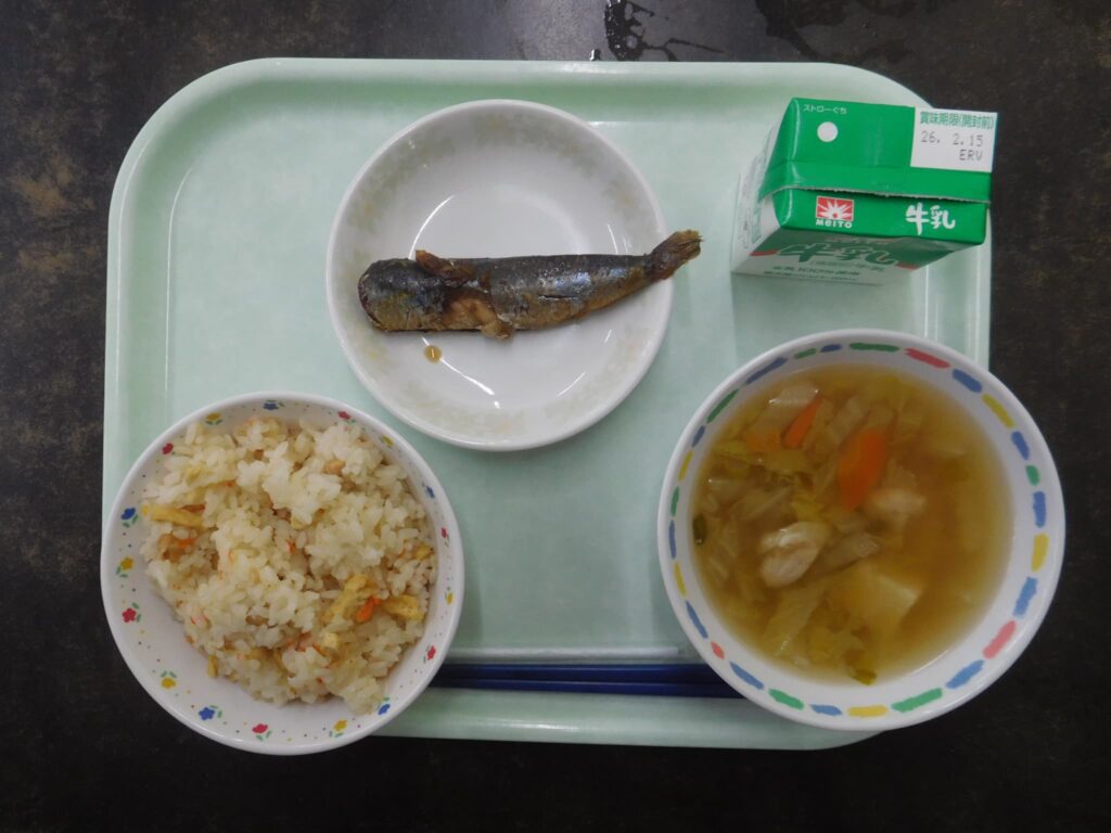 本日の給食は「節分」にちなんだ献立でした。節分と聞くと、豆まきをしたり、恵方巻を食べたりすることを思い浮かべる人も多いと思いますが、地域によっては、「節分いわし」を飾る風習があります。いわしを食べた後の頭に、柊の枝を刺して作った「節分いわし」を玄関に飾ることで、鬼を家に入れない「魔除け」になると言い伝えられているそうです。季節の食材に応じて毎日メニューを工夫していただき、栄養満点でおいしい給食を提供してくださる町学校給食共同調理場の皆様、ありがとうございました。