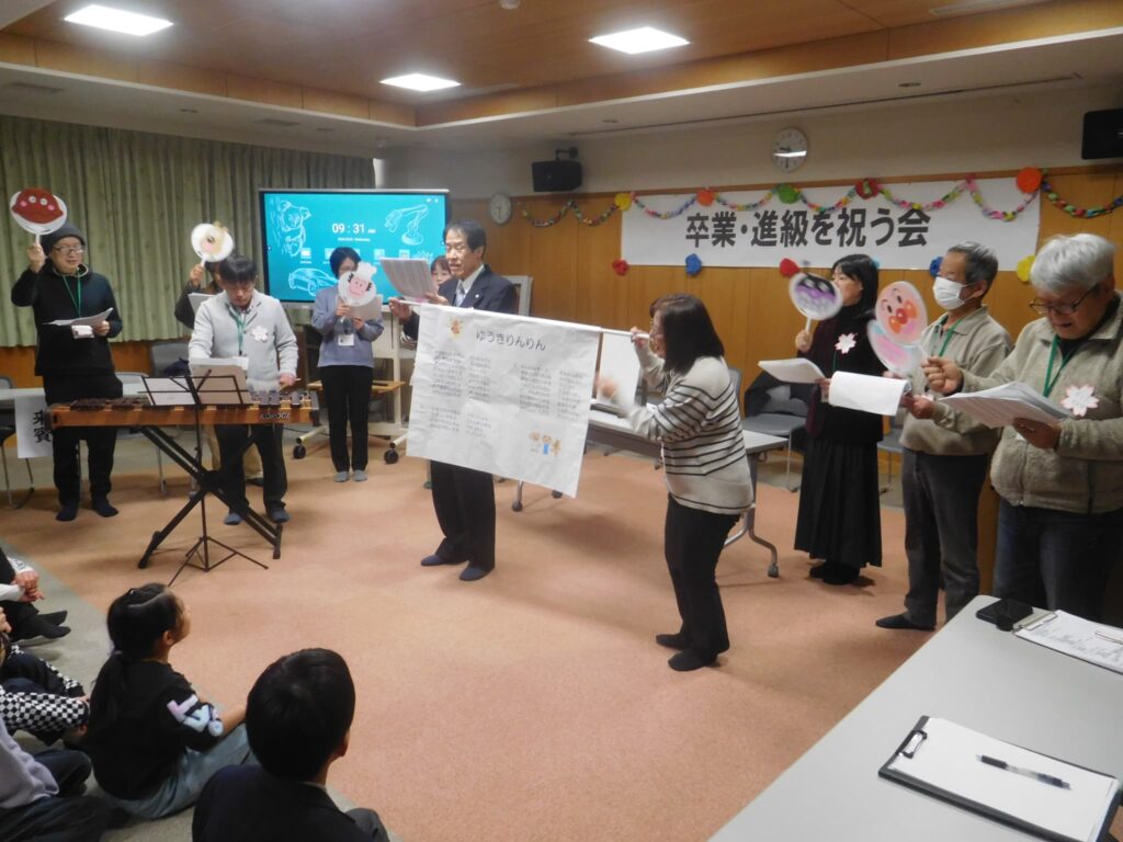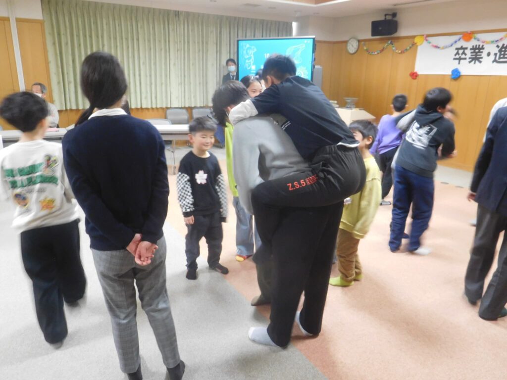 終わりの集いでは、卒業・進級に向けての決意を順番に発表しました。一人一人のやる気が伝わってきて嬉しい気持ちになりました。最後に全員で大きな声で「ビリーブ」を歌い、記念撮影をして閉会となりました。