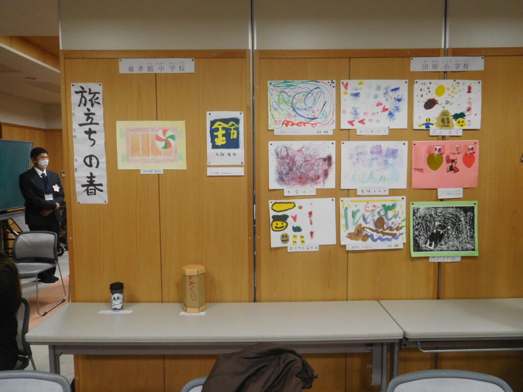 会場となった和みホールでは、本校の生徒が司会を務め、はじめの集い(あいさつや自己紹介)、各校の発表、終わりの集い(決意発表、贈る言葉、記念品の贈呈、写真撮影)という順番で進行しました。はじめの集いでは、民生児童委員さんから「アンパンマン」の大型絵本の読み聞かせをしていただき、参加した全員にとって、とても楽しい時間となりました。各校の発表では、田原小学校の合奏やグループでの演奏、宇治田原小学校の劇や合奏、本校の動画やスライドによる1年間の学校生活の振り返りなど、どの発表も本番までの練習の成果が表れており、会場は大きな拍手に包まれました。休憩時間も壁に貼られた一人一人の作品を見たり、小中学生で一緒に遊んだりして楽しく過ごせ、交流が深まりました。