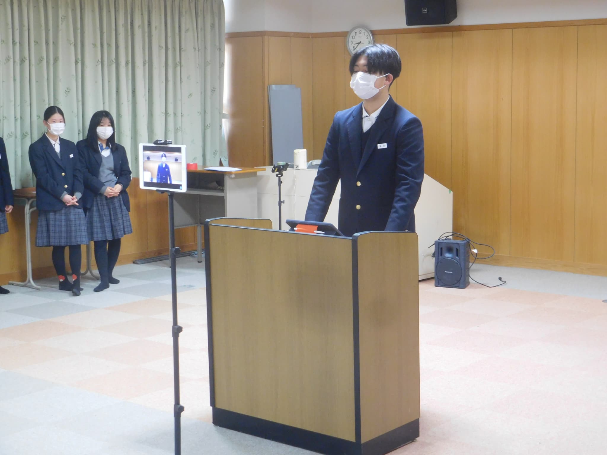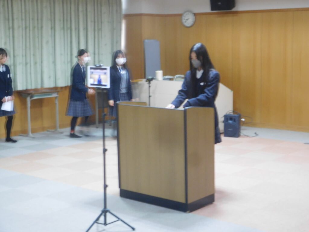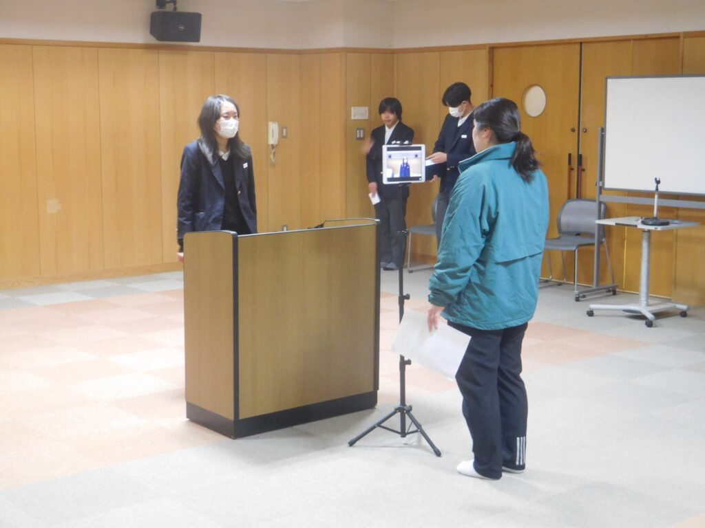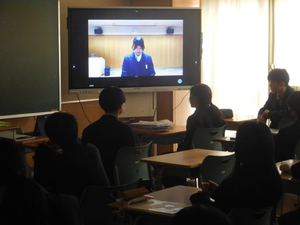 さて、本日(2/24)の朝、和みホールから各教室に向けてオンラインでの朝礼を実施しました。内容は後期生徒会委員会の委員長と3年の学年代表による後期の活動についてのまとめ発表でした。どの生徒も緊張感を持ちつつ、集中してしっかりと発表できました。自分たちの学校生活を自分たちでより良いものにしていこうという気持ちが伝わる発表となりました。これからも生徒が自分たちのよりよい学校生活に向けて主体的に考え、自分たちの願いを実現するために話し合ったり、協力し合ったりできる学校でありたいとい感じた朝礼でした。