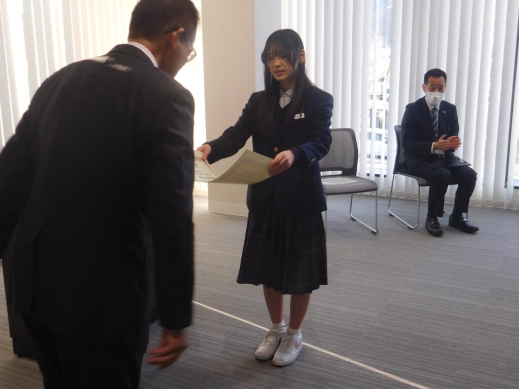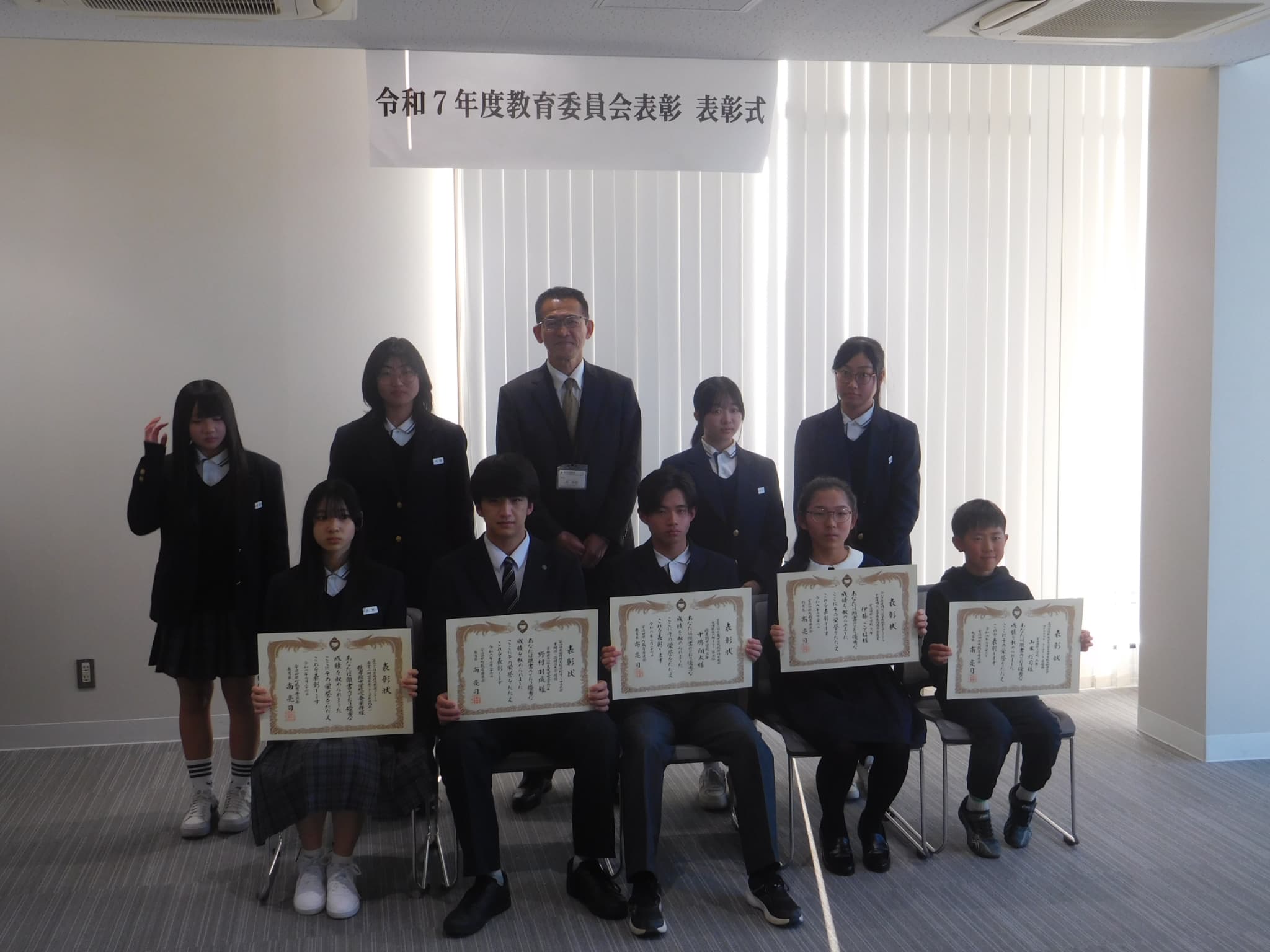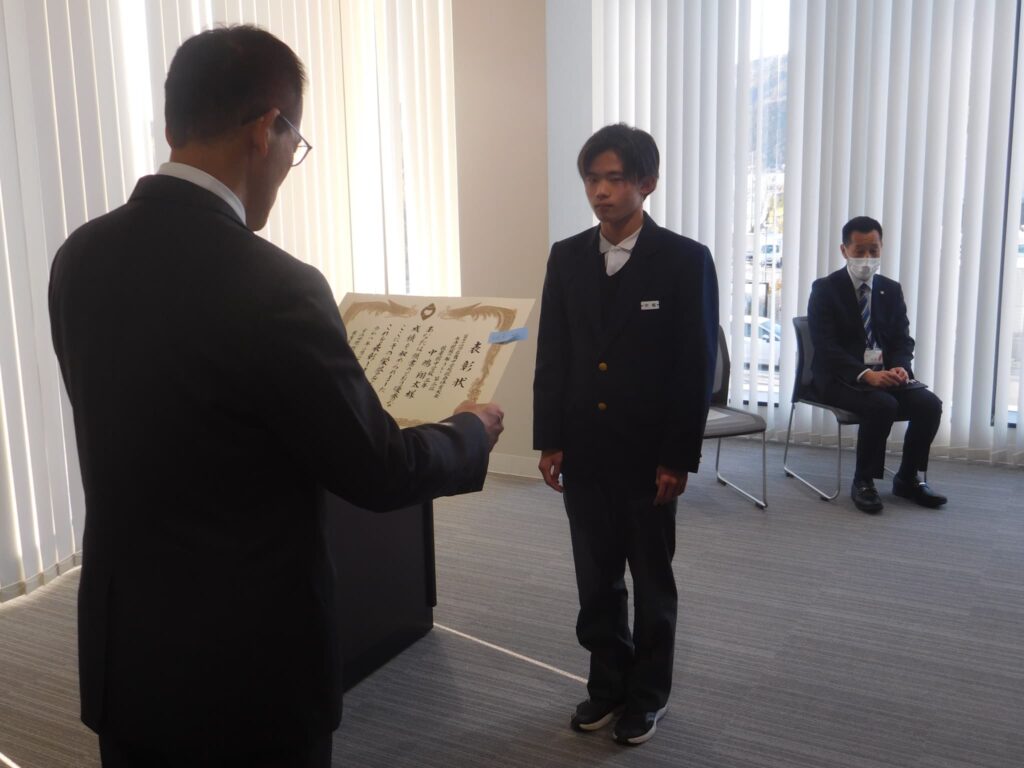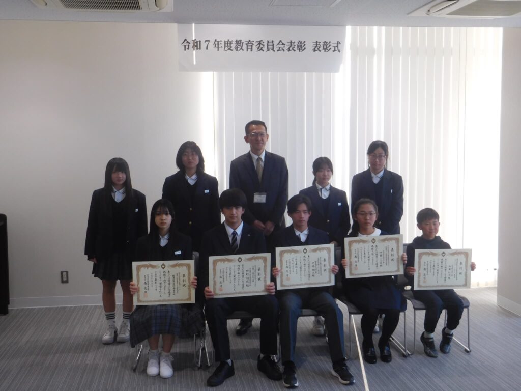 卒業式の前日(3/12)に、令和7年度宇治田原町教育委員会表彰が実施され、本校からは、8月の京都府吹奏楽コンクールで2年連続の金賞を受賞し、本年度は開校以来初の関西吹奏楽コンクールに出場した吹奏楽部と、同じく8月の第74回近畿中学校総合体育大会水泳競技の部で京都府代表として出場し、リレーメンバーとして見事3位に輝いた3年の中島さんが表彰されました。3年間の努力の結晶が素晴らしい成果となって表れ、名誉ある賞をいただくことができました。おめでとうございます。次のステージでも新たな目標を見つけ、ますますのご活躍を願っています。