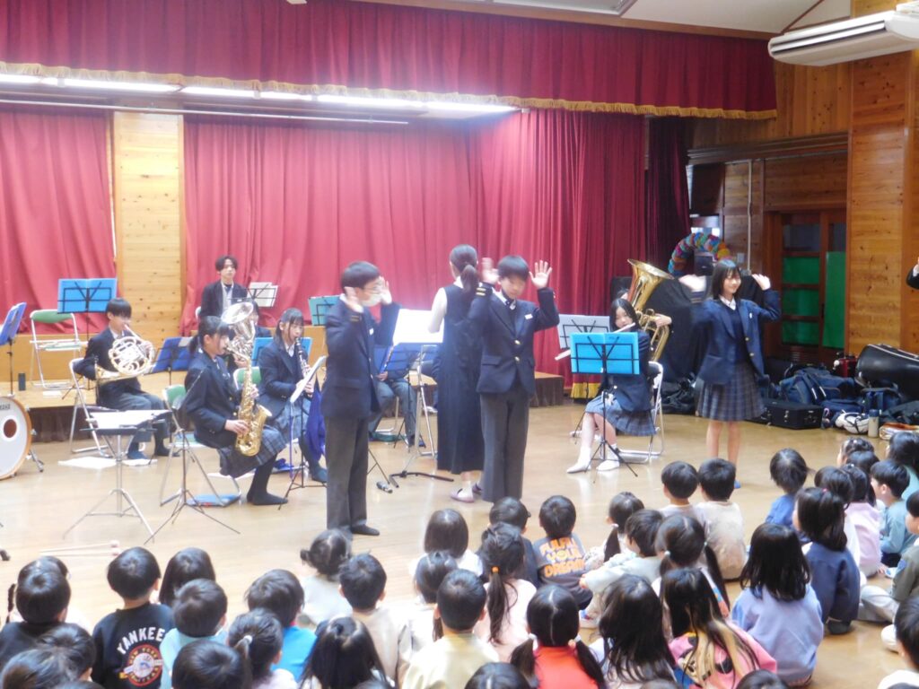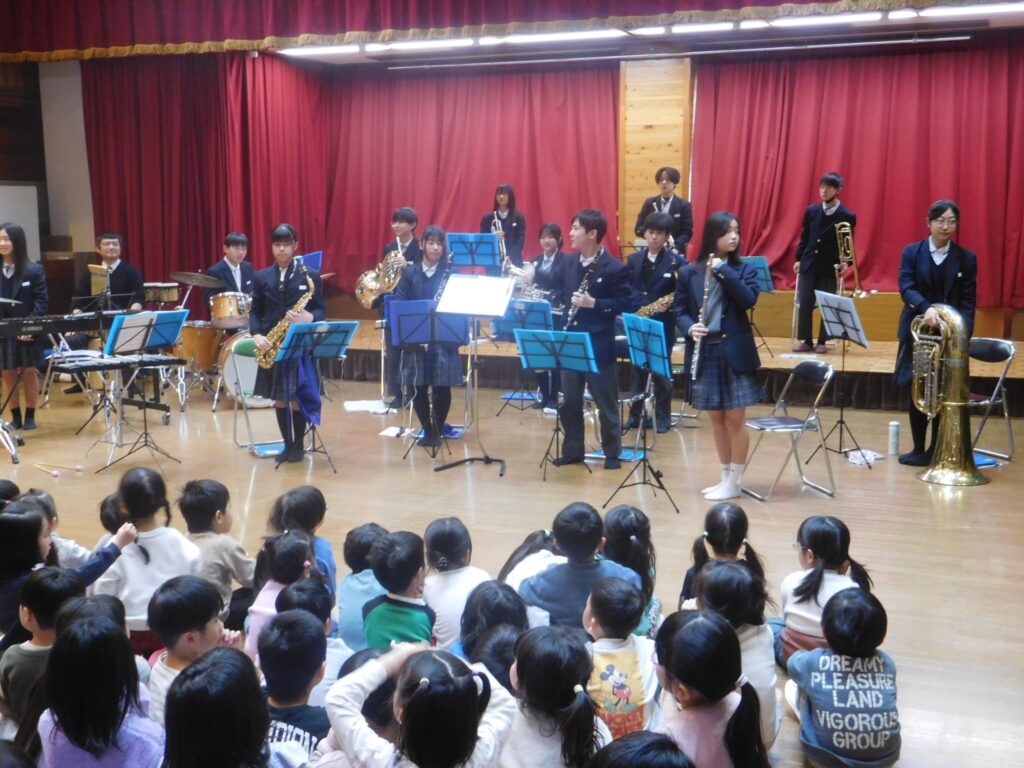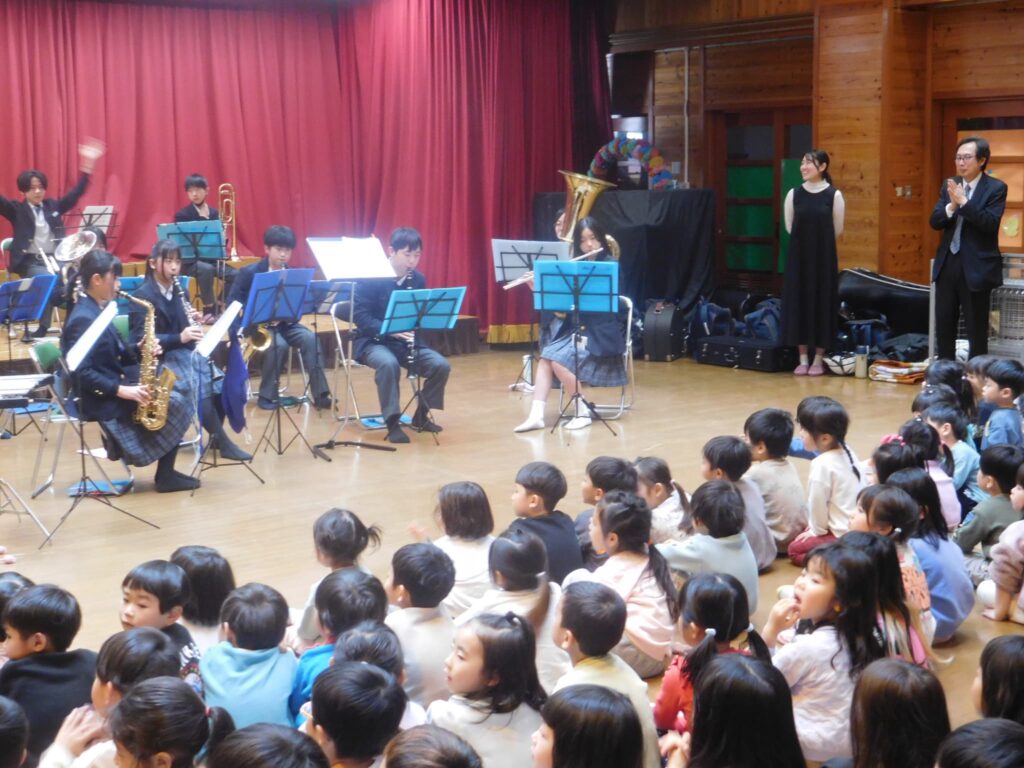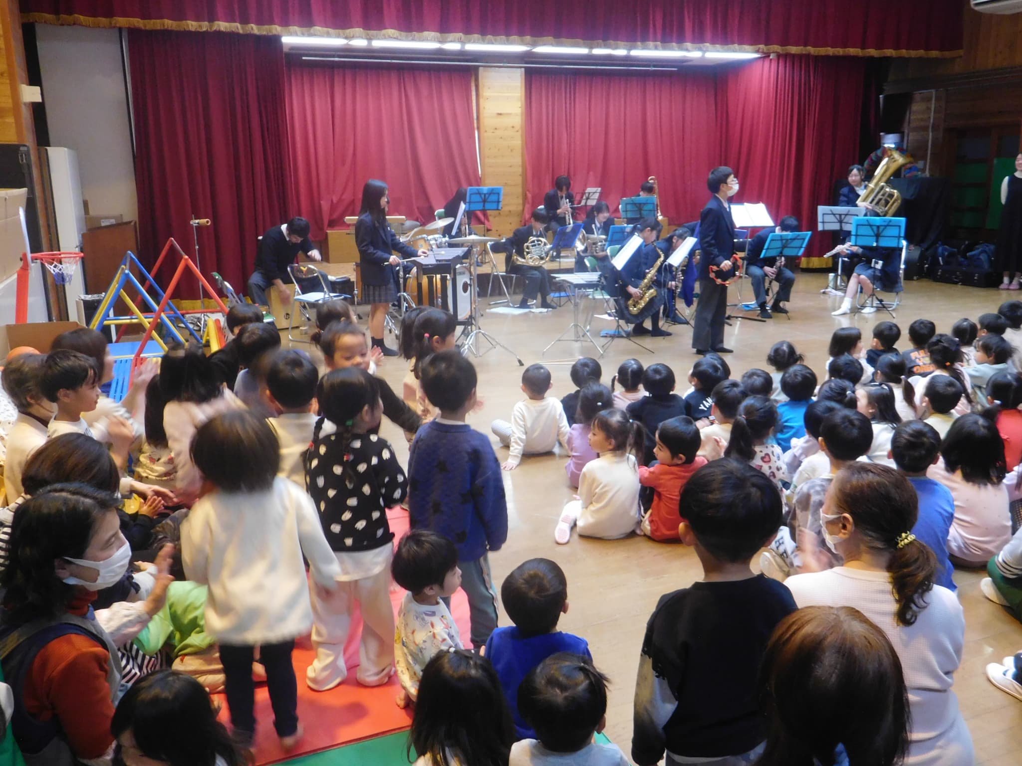 本日(3/26)、宇治田原町立保育所「あゆみのその」で昨年に続き吹奏楽部が春のコンサートを開催しました。コロナ禍のため4年間中止が続いていたコンサートを昨年再開したところ、自分たちの演奏に園児がとても喜んでくれたことがとても嬉しく、今年度も部員一同とても楽しみにしていたコンサートでした。本日も150人を超える大勢の園児さんや保育士さんの前で、「アンパンマンマーチ」、「ドラえもんのテーマ」、「ミッキーマウスマーチ」など園児さんにもなじみのある曲を軽快なMCのもと、時には振りを付けたり、行進したりして楽しい時間を過ごすことができました。みんな大喜びで大きな声援と拍手が沸き上がり、一緒に踊ったり歌ったりする園児さんもいて、笑顔の輪が広がりました。予定していた曲目が終わった後も「アンコール」の声が響き、最後は「学園天国」を演奏し、会場が一体となった手拍子の中で盛り上がり、終了となりました。会場にいた皆さん、子どもも大人も笑顔で幸せな気持ちになる温かい演奏会となりました。吹奏楽部の皆さん、お声かけくださった「あゆみのその」の皆様どうもありがとうございました。