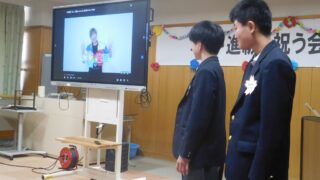 昨日(2/4)、町内の3小中学校の特別支援学級に在籍する児童生徒の卒業・進級を祝い、お互いの交流を深めるねらいで「卒業・進級を祝う会」を開催しました。 会場となった和みホールでは、本校の生徒が司会を務め、はじめの集い(あいさつや自己紹介...