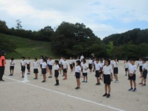 開会式は放送で行い、低学年、中学年、高学年の順でグラウンドに出て走りました。曇り空で暑すぎることもなく、絶好のコンディションでした。
