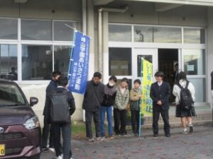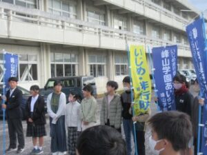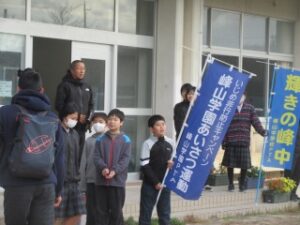 今日は、小学校の児童会本部が峰山中学校に行って峰山学園小中あいさつ運動を行いました。この取組は、普段各校でしている挨拶を小学校・中学校と一緒にして交流しようとするねらいがあります。