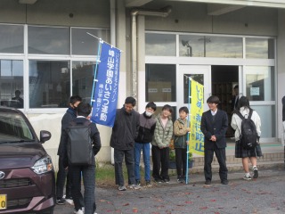 あいさつ運動の旗を持ち、大きな声であいさつしました。いさなご小学校の卒業生も、初めて出会う人にも大きな声であいさつしました。中学生からも「おはよう」のあいさつが返ってきて嬉しそうでした。