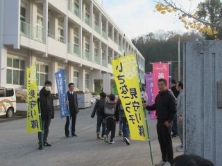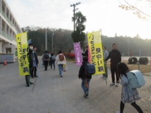 学校校門の所では、PTA本部役員の皆さんが立ち、挨拶をしました。前回1学期の時には大雨の中での実施でしたが、今回は寒かったですが晴れた中で実施でした。