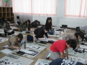 1・2年生は硬筆(鉛筆・ペン)で、3年生以上は毛筆で書きます。2学期・冬休みに練習したので、初めて書いた字よりも上手に書けていました。