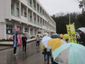 今年度3回目のあいさつ運動を行いました。今回も傘を差しながらのあいさつ運動となりました。