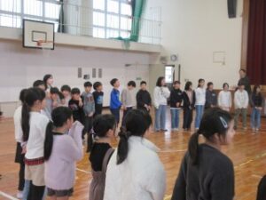 最後は、全員で大きな輪をつくり、いさなご小学校の校歌を歌い、大きな声が体育館に響きました。全員で輪になっているので、みんなの顔を見ながら歌えてよかったです。