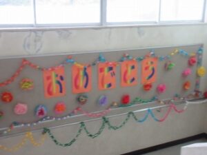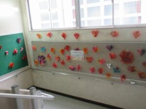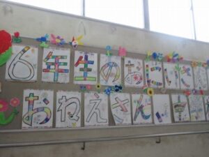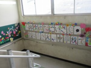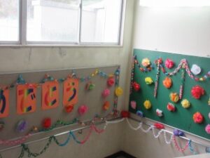 階段のおどり場には、各学年がお祝いの飾りをしています。