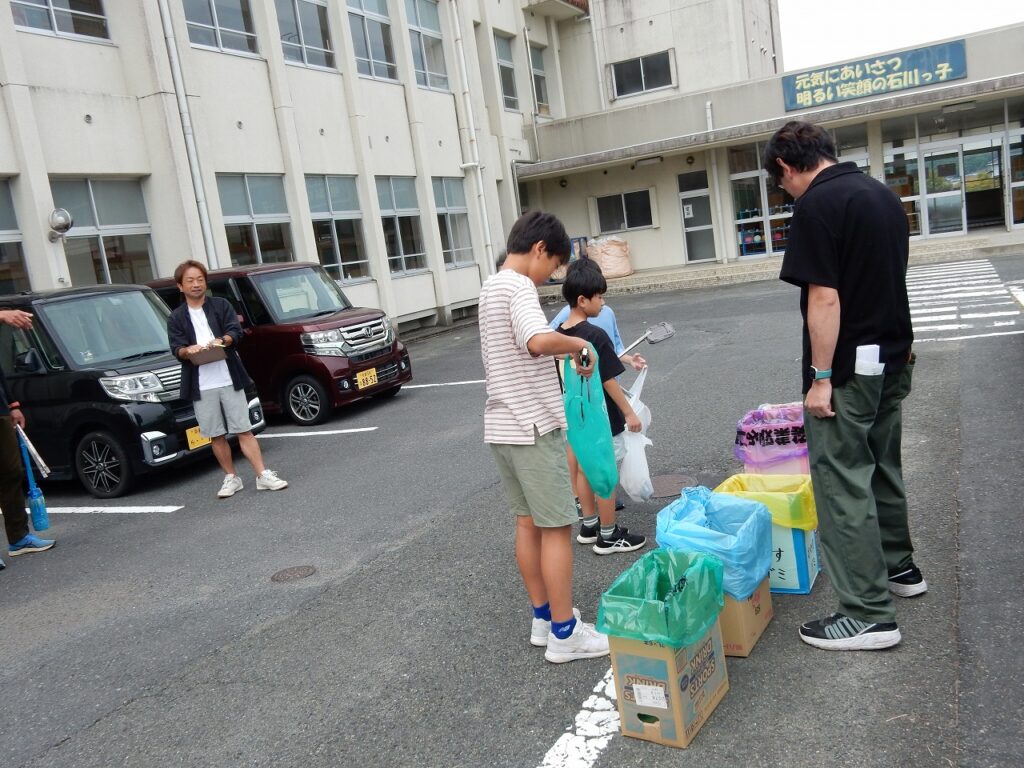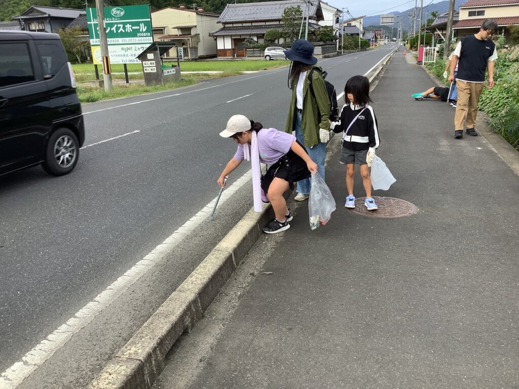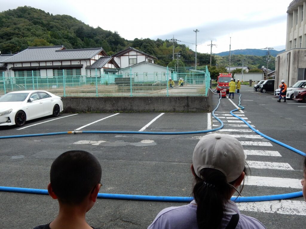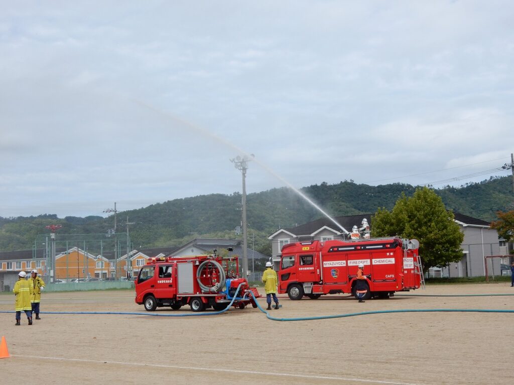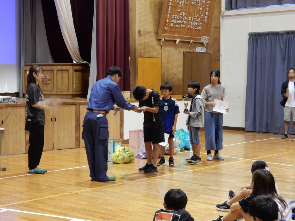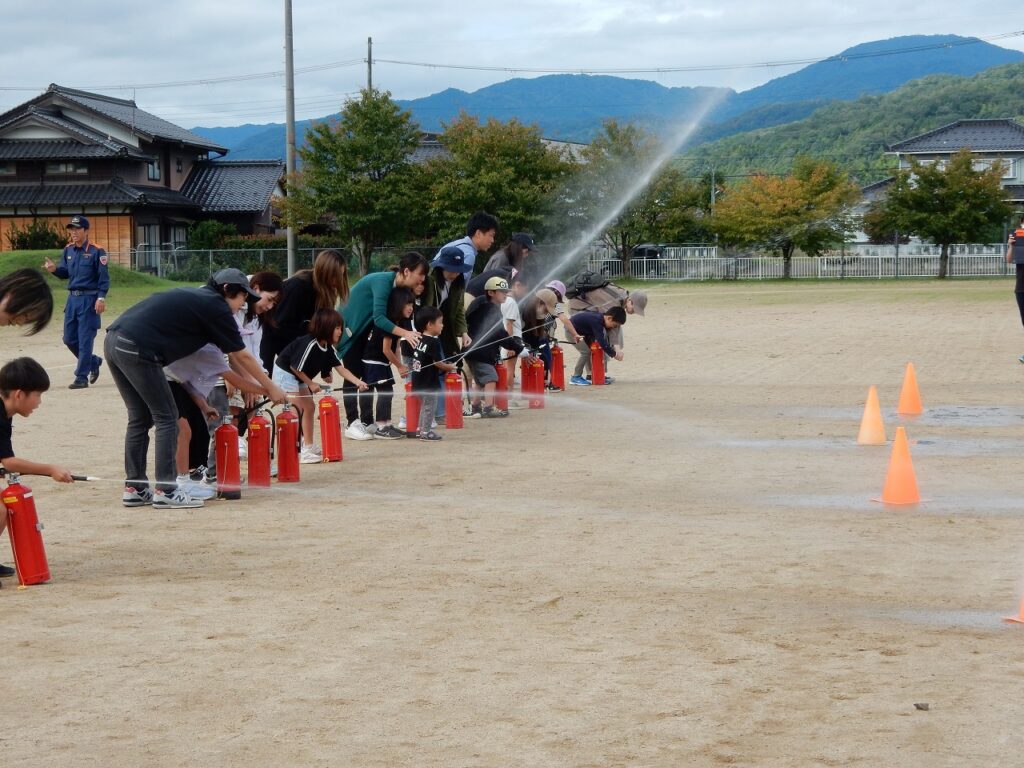 親子で触れ合う、何かよい取組はないか・・・。PTA本部役員の皆さんの「通学路を親子できれいにしよう!」「地域の防災の取組にも関心をもってもらおう!」という思いが、この取組につながりました。前半のクリーン作戦では、「ペットボトルやたばこのごみが多いぞ」「靴下も落ちているよ」と話しながら親子で歩きました。後半は、石川区の消防団や宮津・与謝消防署の方々にもお世話になり、消火器での消火体験やポンプ車での消火活動を間近で見学するなど、普段できない体験をさせていただきました。