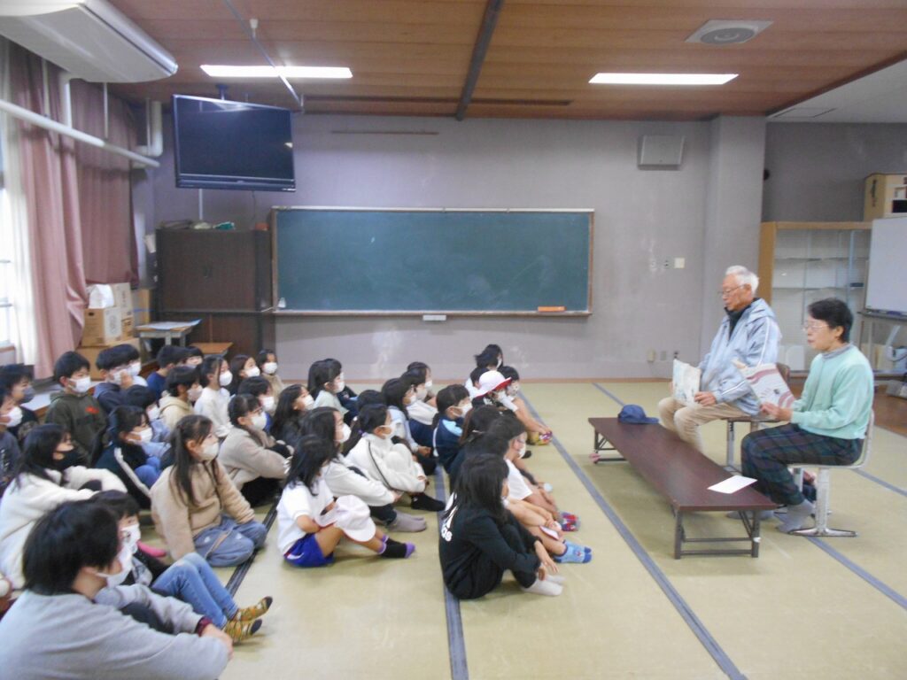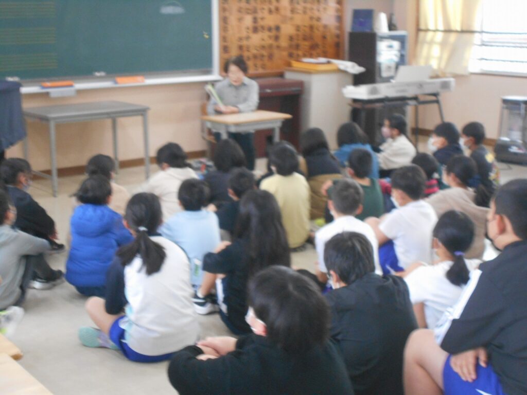 子どもたちに本に親しんでほしいと、与謝野町の社協の方が読み聞かせに来てくださいました。低・高学年に分かれ、それぞれに合った本を読んでいただきました。くすっと笑ったり、場面を想像しながら真剣な表情で聞いたりと、本の世界に引き込まれている様子でした。