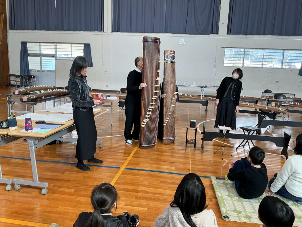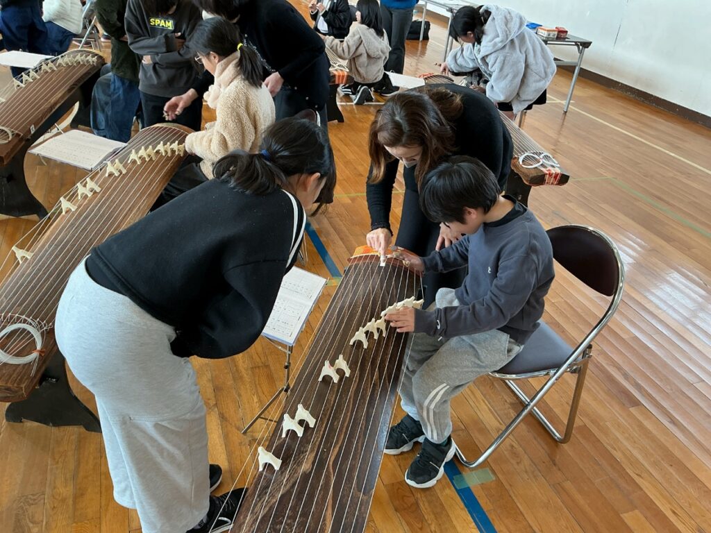 「琇邦会」の皆様にお世話になり、筝の演奏体験をしました。筝が日本に入ってきた歴史や、筝のつくり等について教えていただき、初めて知ることばかりで驚いていました。漢数字で書かれた譜面を見ながら演奏した筝の音色は、とても美しく、「さくらさくら」が弾けるようになったと喜ぶ様子がありました。子どもたちの上達ぶりは、目を見張るものがありました。