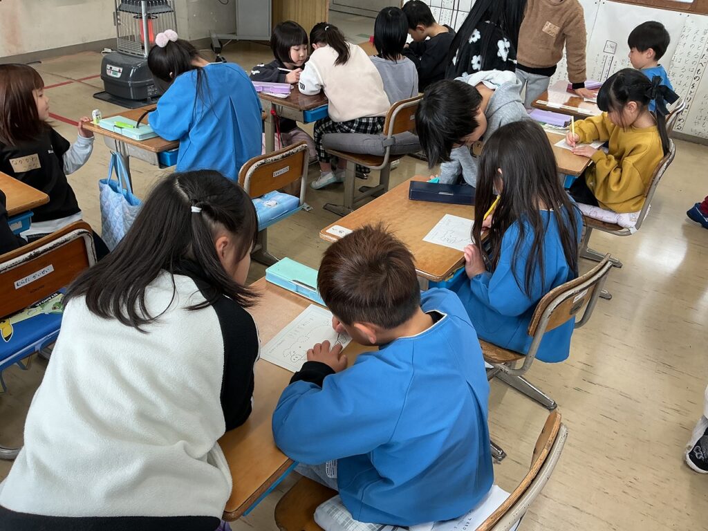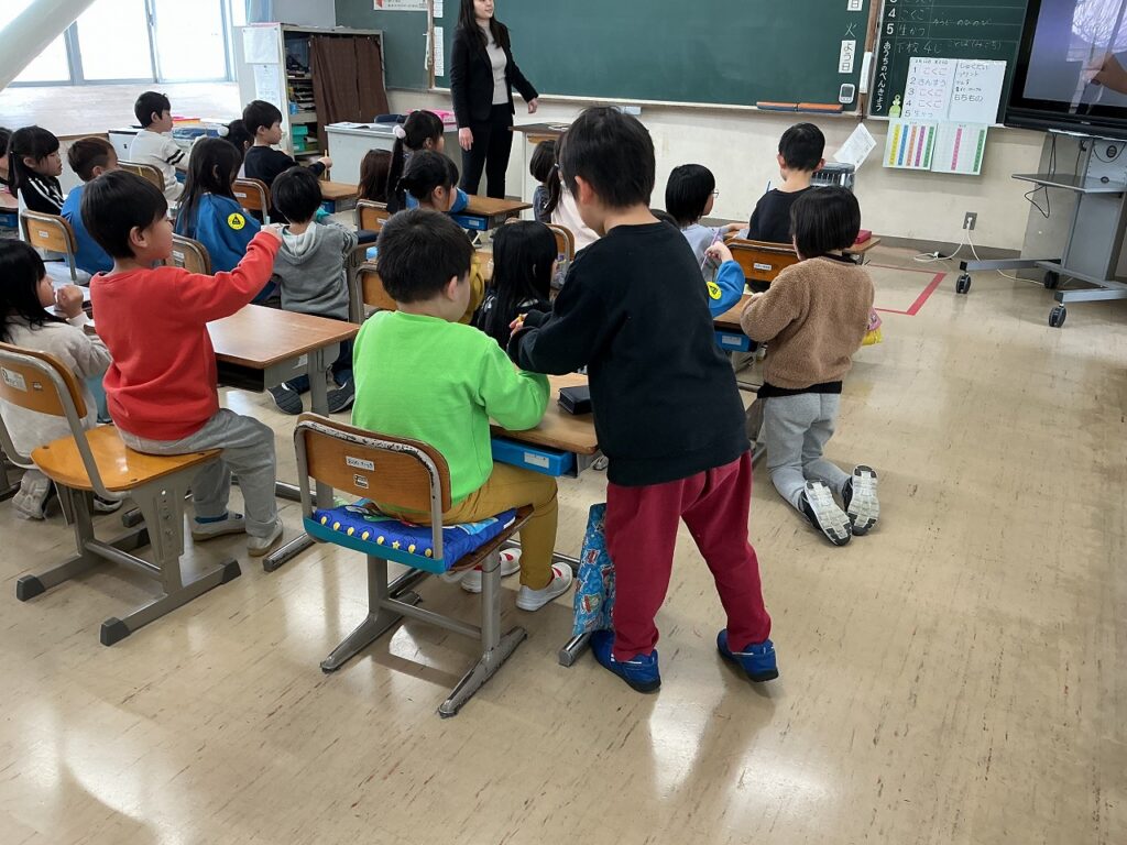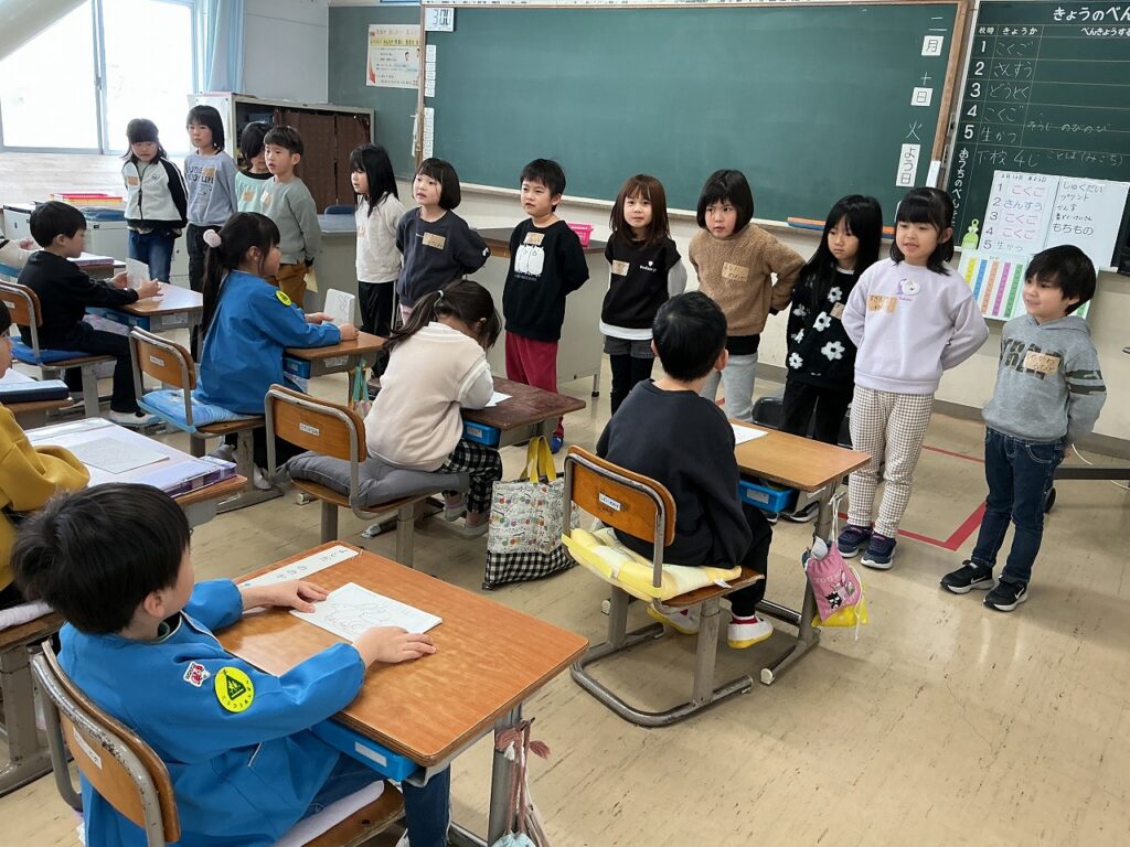 1年生と5年生が代表して、新1年生を迎えて交流しました。可愛い年長さんたちが小学校入学を楽しみにしてもらえるようにと考え、準備してきました。1年生は、音読など、できるようになったことを発表したり、鉛筆の持ち方を教えてあげたりしました。とても甲斐甲斐しい姿がほほえましかったです。5年生は、手作りの案内看板を辿りながら学校を案内したり、鬼ごっこなどをして一緒に遊んだりしました。分かりにくい説明は実演をして見せるなど、臨機応変な姿に、もう最高学年への準備ができているなと思えました。
