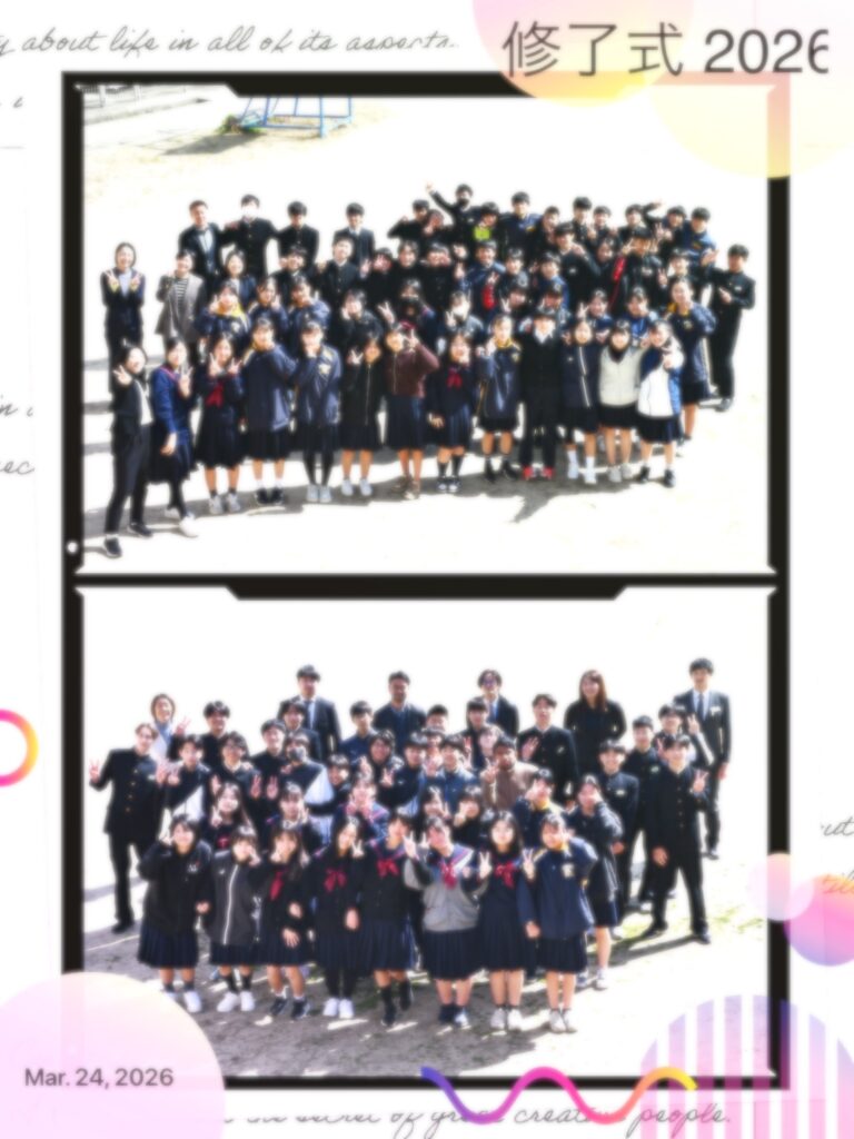 式後にはグラウンドに移動し、各学年ごとに集合写真を撮影しました。晴れやかな表情が印象的で、1年間をともに過ごした仲間との思い出を改めて感じるひとときとなりました。
