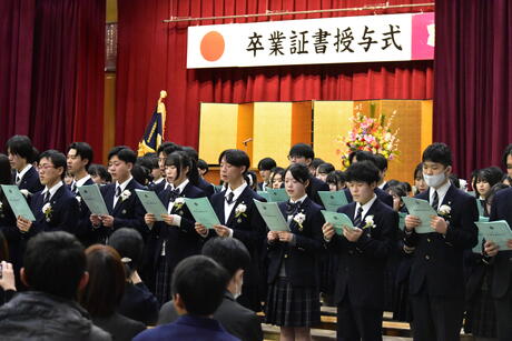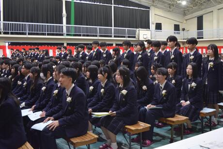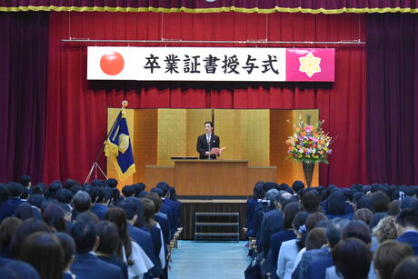 野村校長は式辞で、社会情勢の激しい変化や科学技術の飛躍的な進歩が続く時代の中で、健やかにたくましく成長してきた生徒達を称え、今日という日を祝しました。