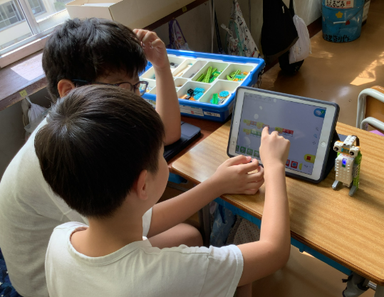 レゴを組み立ててロボットを作り、アプリを使って動かすプログラミングを考えます。