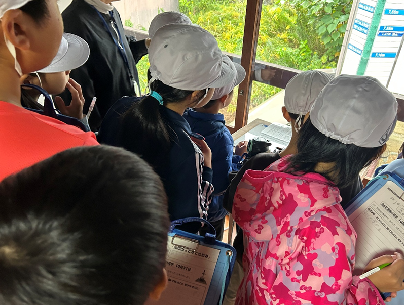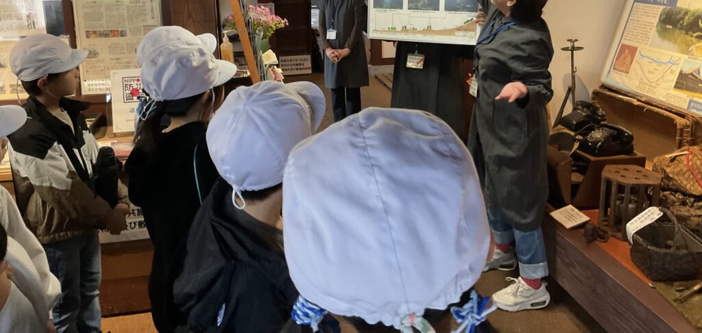 3年生は、総合的な学習の時間で治水記念館の見学をしました。見学では、水害と水防の歴史について話を聞いたり、タカと呼ばれる荷上げ用の滑車の体験をさせていただいたりしました。また、福知山市に古くから残る町屋を生で見ることができ、当時のことをより身近に感じることができました。