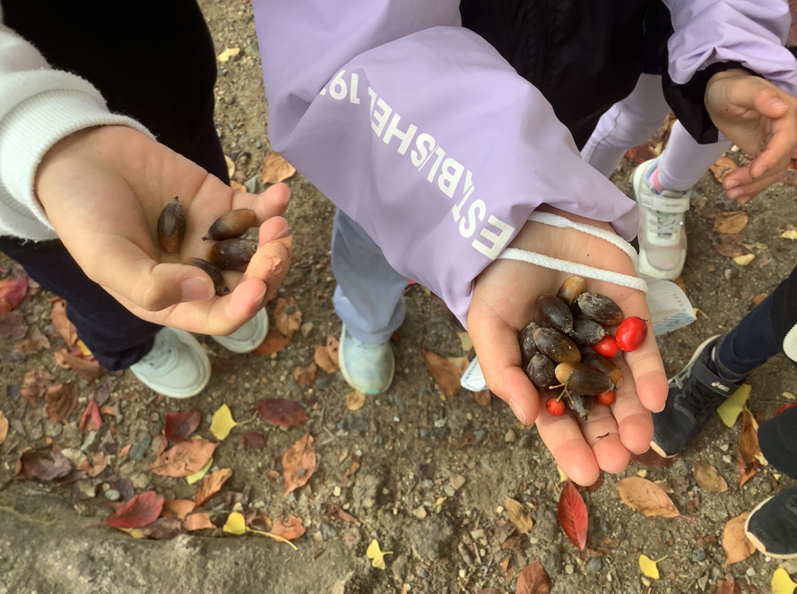 惇明の秋 発見! Twitter Facebook はてブ Pocket LINE コピー 2025.11.14 1年生では、生活科の学習で「秋見つけ」をしています。秋を感じる物や場所を一生懸命探しています。どんぐりや落ち葉、木の実などたくさんの秋を発見することができました。見つけた木の実や落ち葉は、リース作りに使いたいと思います。楽しみですね。