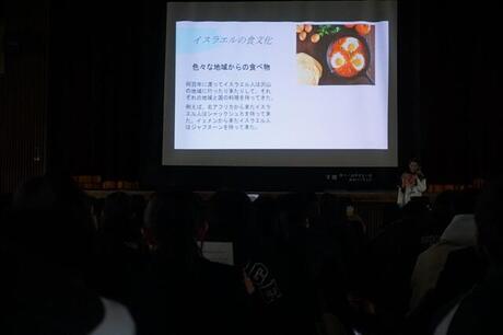 講演では、大学院での研究内容や日本への留学を決めたきっかけ、日本での生活の印象、日本の好きな場所や食べ物についてお話しいただきました。また、日本とイスラエルの地域、人口、言語、食文化、スポーツの違いに加え、イスラエルの主な観光地についても、写真を交えながら分かりやすく紹介していただきました。