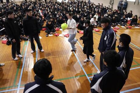 講演の最後には「イスラエルのボール遊び」を教えていただき、代表生徒が実際に体験しました。会場は大いに盛り上がり、生徒たちは楽しみながら異文化に触れることができました。